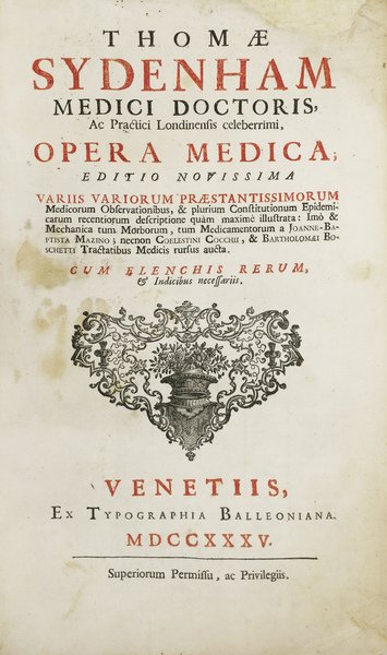 In-4 gr. (mm. 373x225), p. pergamena molle coeva (risguardi rifatti), tit. ms. al dorso, pp. (16),536,75, frontespizio con titolo in rosso e nero, testo su due colonne, ornato da testatine, capilettera figur. e finali inc. su legno e con 1 tav., ripieg., inc. in rame e fuori testo Al fine il Supplementum operum medicorum Thomae Sydenham.Il vol. contiene anche: Dissertationes duae: De Arthritide symptomatica. De Arthritide anomala, sive interna di G. Musgrave - Mechanica morborum et medicamentorum di J.B. Mazino - Epistolae Physico-Medicae di A.C. Cocchi - De salivatione mercuriali dissertatio physico-medico-mechanica di B. Boschetti.Thomas Sydemham fu un celeberrimo medico inglese (1624-89) "sa reputation a été colossale.. l'Angleterre le nomma son Hippocrate" cosi' Biographie Médicale,VII,289 - Eloy,VI,260-263 - Olschki,VII,9584 cita un'ediz. del 1757 - Morton,63 che cita l'Opera Omnia: "Sydenham is one of the greatest figures in internal medicine. His reputation rests on his first-hand accounts of such conditions as the malarial fevers of his times, gout, scarlatina, measles, etc.".Frontespizio e prime 3 carte restaurate al marg. super. per manc. (non di testo), qualche lieve alone ma complessivam. un buon esemplare.