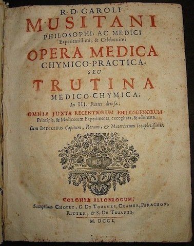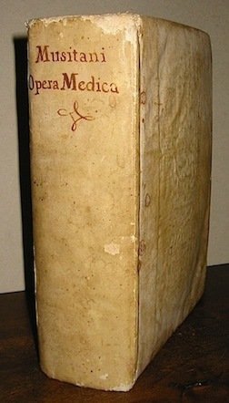 4to, 15 cc.nn., 760 pp. (compresa ultima bianca), (segue) Pyretologia sive tractatus de febribus., ibidem 174 (cm. 21,4), 15 cc.nn., 760 pp., (segue) Pyretologia01, 4 cc.nn., 213(3) pp. (segue) Pyrotechnia sophica., ibidem 1701, 4 cc.nn., 200 pp., 4 cc.nn. (segue) Celeber. virorum apologiae pro R. D. Carolo Musitano adversus Petrum Antonium De Martino mrdicum geofonensem., Kruswich, apud Petrum Antonium Martellum 1700, 101 (3) pp. (unito) Lizzanus Jo. Andrea, Martinus in Trutina, sive apologetica per Dialogos Disquisitio., ibidem 1700, da pag. 105 a pag. 196, 6 cc.nn. (compresa ultima bianca) Ottima legatura coeva in piena pergamena con titolo ms. al ds. Tagli spruzzati. Primo frontis. stampato in rosso e nero. Testo su due colonne. Piccola mancanza alla cuffia superiore, alcune ingialliture, ma bell’esemplare. Prima edizione in lingua latina. Primo e terzo degli scritti in Blake, p. 317; quarto e quinto in Krivatsy, p. 719. Musitano è stato uno dei più celebri docenti di suoi tempi ed i suoi lavori costituiscono una importante fonte di documentazione delle terapie antiche. Di particolare rilievo le sue indicazioni sui trattamenti per i disturbi psicologici e mentali.