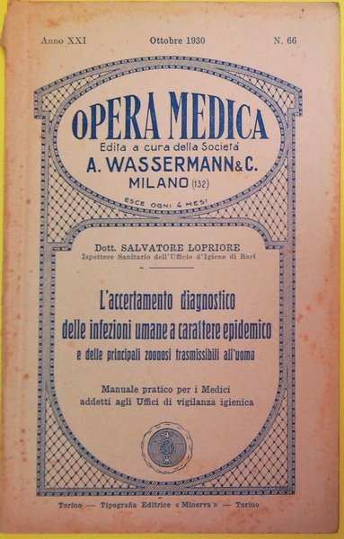 Opera medica edita a cura della Società A. Wassermann & C. Milano. Dott. Salvatore Lopriore. L'accertamento diagnostico delle infezioni umane a carattere epidemico e delle principali zoonosi trasmissibili all'uomo. Manuale pratico per i medici addetti agli uffici di vigilanza igienica.