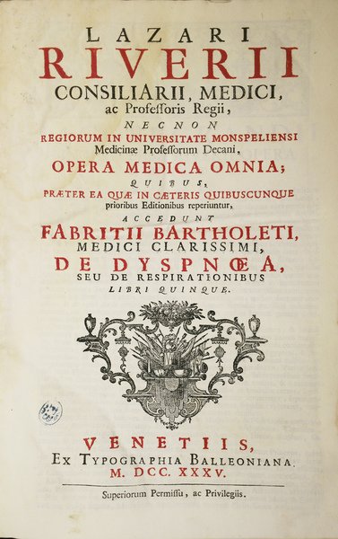 In-4 gr. (mm. 350x221) - 2 parti in 1 vol. - legatura ottocentesca in mz. pergamena, pp.num. XXIV,572,(4),208, tit. in rosso e nero, ornato da testate, grandi capilettera figurati a vignetta e finali, inc. su legno. L'opera comprende: Institutionum Medicarum Libri V - Praxeos Medicae Libri XVII - Observationum Medicarum & Curationum insignium Centuriae quatuor, cum Observationibus rarioribus, & ab alijs communicatis - Arcana, nusquam in lucem edita" (segue) "De Dyspnoea" del bolognese Febrizio Bartoletti (1586-1630) con una figura a p. pagina relativa al Pneumatolabium. La sua "Praxis Medica" è una delle opere importanti dell'epoca.Cfr. Wellcome,IV, p. 535 - Blake, p. 383 - Morton,2727 che cita l'ediz. di Francoforte, 1674: "Riverius was the first to note aortic stenosis" - Olschki,VII,9415: "Riverius introduisa le premier la méthode spagirique de Paracelse dans l'université de Montpellier" - Eloy,IV,288: "Lazare Rivière (1589-1655), Medico Consigliere del Re, fu Decano dei Professori di Medicina della Regia Università di Montpellier". Con aloni e fiorit.; rifilato al margine super., ma complessivam. un buon esemplare.