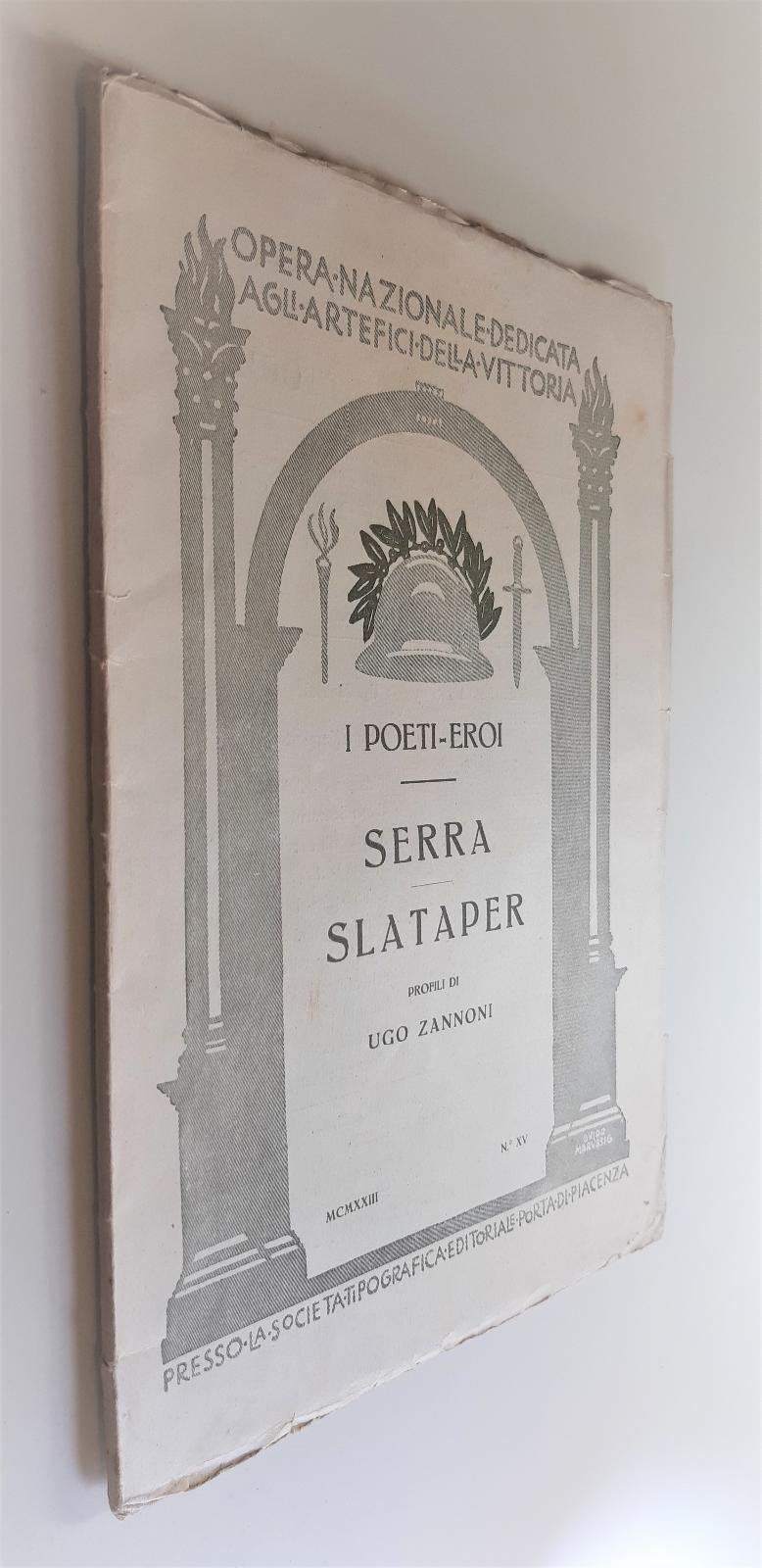 Opera Nazionale dedicata agli artefici della Vittoria i poeti eroi Serra Slataper profilo di Ugo Zannoni editoriale porta di Piacenza 1923 numero 15 Copertina morbida editoriale con piccole pieghe strappi ai margini aloni al piatto anteriore, alla quarta di copertina alcune fioriture, in buono stato alla prima pagina fotografie di Scipio Slataper e Renato Serra con alcuni aloni, lieve brunitura al margine esterno delle pagine numero pagine 48 le ultime a fogli chiusi dimensioni 26 x 18