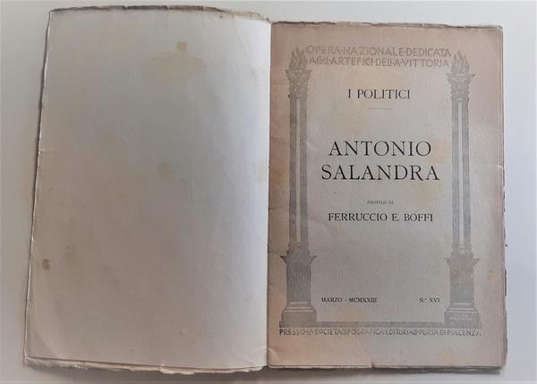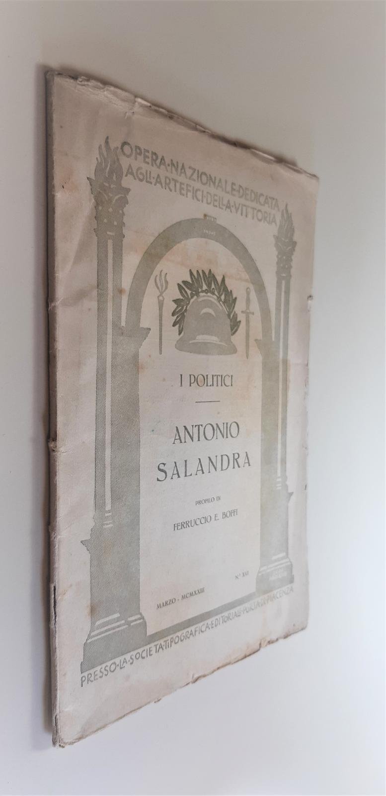 Opera Nazionale dedicata agli artefici della Vittoria i politici Antonio Salandra profilo di Ferruccio e. Boffi 1923 numero 16 Societ‡ tipografica editoriale Porta di Piacenza