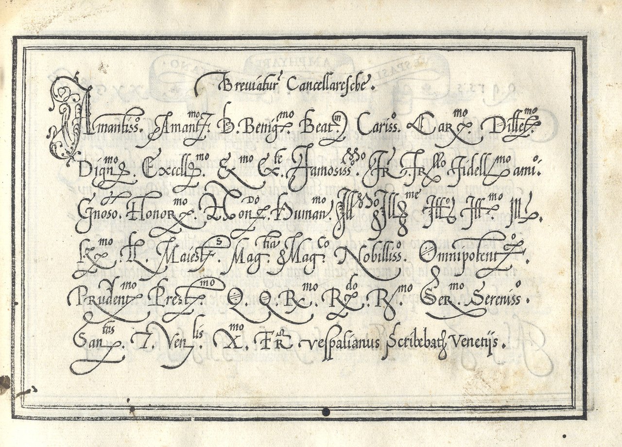 >in-8 oblungo, ff. (48), leg. in p. perg. di poco poster., in astuccio in tela. Impresa tipogr. al titolo, iniz. silogr. I primi 4 ff. contengono il frontespizio, la dedica dell'a. al Doge Francesco Donato, l'avviso ai lettori, l'insegnamento "A far aqua gommata per distemperare azurro et per macinar oro da scrivere", cui segue la "Recetta per scrivere con cinaprio"; gli altri 43 fogli contengono esempi di scrittura cancelleresca corsiva e singole lettere alfabetiche realizzate nelle più svariate forme; negli ultimi 2 ff. altre ricette ed il registro. Seconda edizione (la prima era apparsa nel 1548 col titolo "Uno novo modo d'insegnar a scrivere et formar lettere di più sorte") di quest'opera rara ed importantissima, composta soprattutto per facilitare la pratica della scrittura mercantile. Frate Amphiareo Vespasiano da Ferrara (1501-1563), minore conventuale, fu tra i più illustri calligrafi del XVI secolo e questa sua opera ebbe enorme successo e numerose ristampe fino al 1620. Bell'esempl., con antica firma di possesso sul tit. (piccoli restauri al margine super. di alcuni ff. e qualche macchia qua e là). BONGI I, p. 436-7. BONACINI 48. BERLIN KAT. 5183. BMC STC VII, 22.