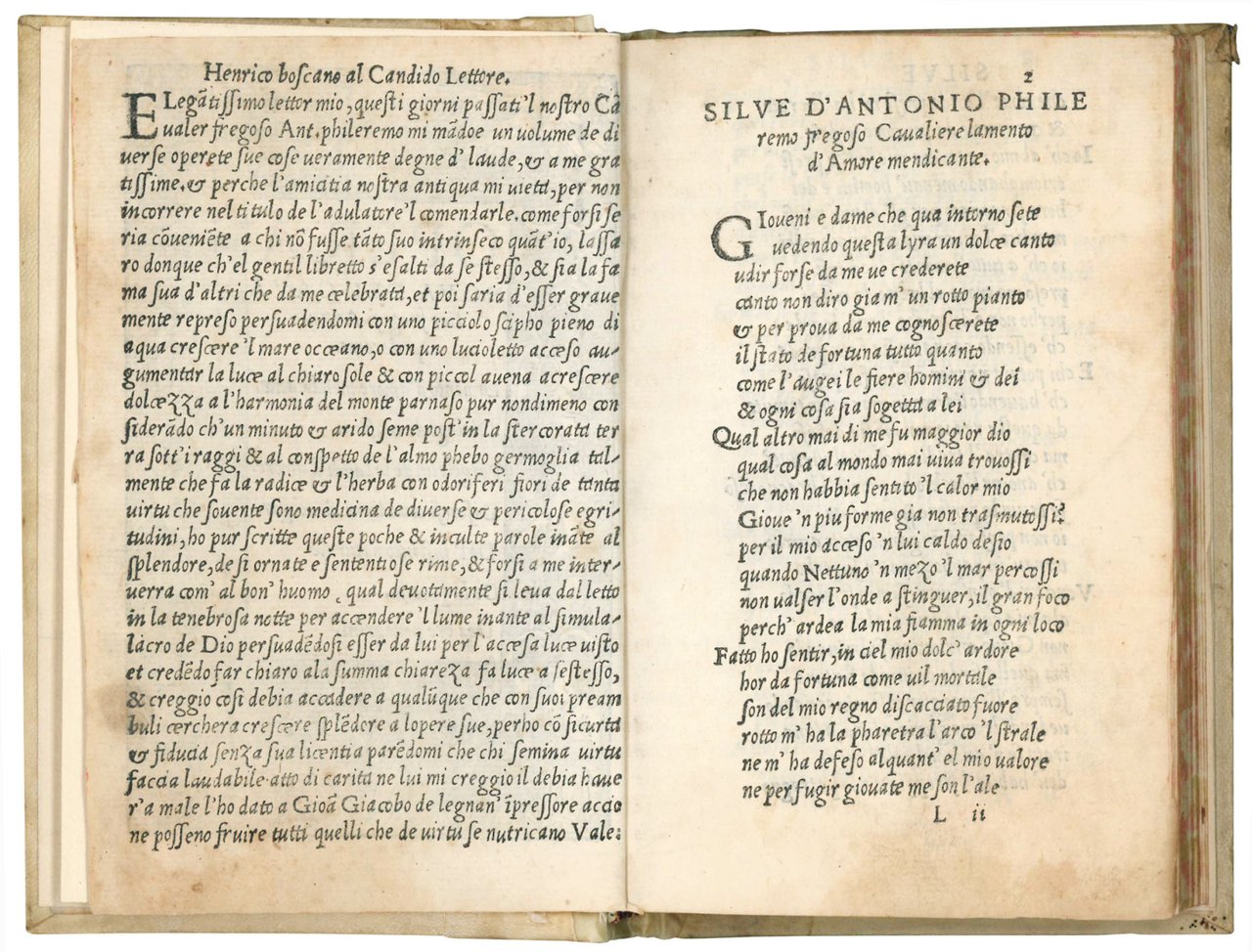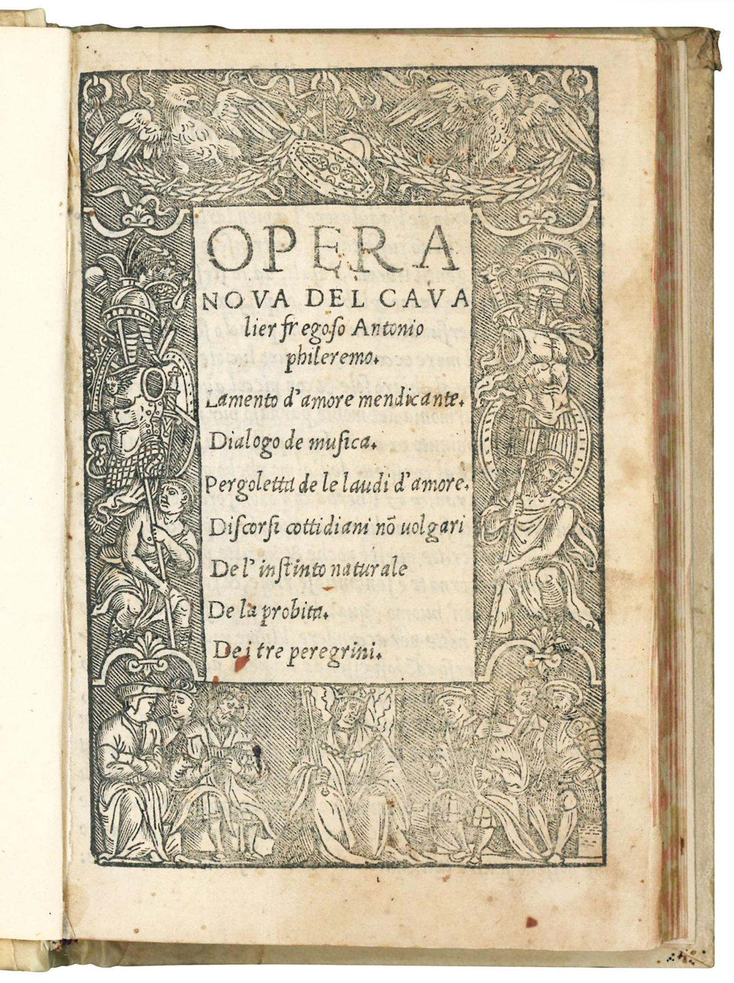 Rare second edition. In 1521 Fregoso vulgarised Lancino Curti's Silvae and in 1525 in Milan at Giovanni Giacomo Da Legnano and Bartolomeo da Crema's press he published his own ‘silvae', also known as Opera nova, which includes Lamento d'Amore mendicante, Dialogo de musica, Pergoletta de le laudi de Amore, Discorsi cottidiani non vulgari, De lo istinto naturale, De la probità and, finally, De i tre peregrini.