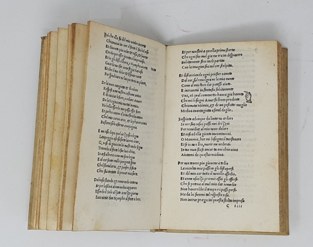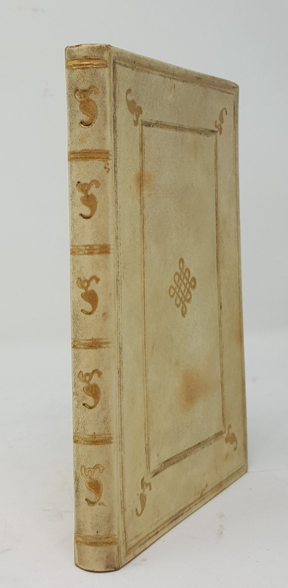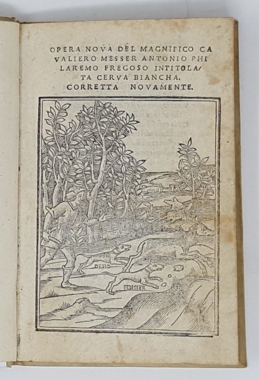 >in-8, ff. 76 n.n., bel carattere corsivo, attraente legatura ottocentesca ad imitazione antica in pergamena, ai piatti riquadro, nodo alla greca e foglioline cuoriformi, ripetute al dorso, il tutto impresso in oro. Grande e bella silografia al titolo (mm 104x80), raffigurante un cacciatore e due cani (Desio e Pensier) che rincorrono una cerva bianca nella foresta. Edizione rara e ricercata (princeps, Milano, Mantegazzi, 1510), di questo «poema in sette canti per complessive 505 ottave, con due carmi in terzine dopo il fine. In esso l'autore rievoca allegoricamente un'avventura amorosa della sua giovinezza , con descrizione precisa di vari episodi di caccia» (Ceresoli). Si narra di una immaginaria caccia a Mirina, ninfa di Diana tramutata in cerva, con la quale l'autore si inoltra nella città di Erotopoli per recuperare i suoi cani che, alla fine del poema, gli verranno resi da Adone. Il Fregoso fu valente poeta d'origine genovese (nato intorno al 1460 e morto dopo il 1532), autore di sonetti burleschi e poemetti allegorici di notevole fama; visse per lo più a Milano, prima alla corte di Ludovico il Moro e poi in una villa di campagna, in perfetta solitudine (donde il nome d'arte ''Fileremo''). Esemplare assai fresco e bello, lievissime fioriture a pochi fogli, un poco più evidenti al titolo. STC 280. Sander I, 2926. Essling 2926. Kristeller 156 a. Ceresoli, Bibliogr. caccia 258: ''Edizione anche questa piuttosto rara''. Brunet II, 1388. Bibl. Cavalieri 783. Olschki, Livres à figures, 525.