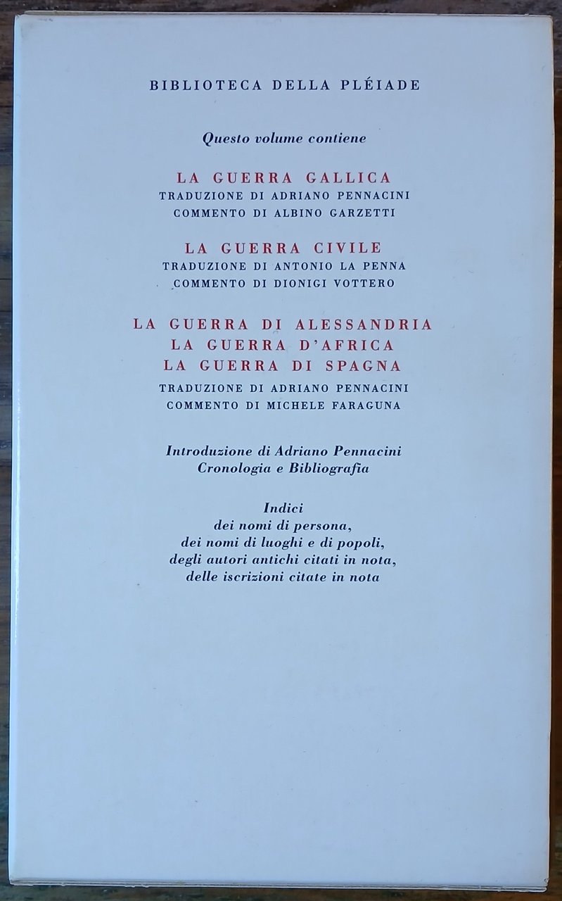 In 16° grande, legatura editoriale in piena pelle con titoli ed impressioni in oro al dorso, sovraccoperta in acetato trasparente, taglio di testa colorato, doppio segnalibro in tessuto, custodia in cartoncino figurato, pp. L,(28),1662,(4), con illustrazioni e cartine nel testo. Il volume contiene : "La guerra gallica", traduzione di Adriano Pennacini e commento di Albino Garzetti ; "La guerra civile", traduzione di Antonio La Penna e commento di Dionigi Vottero ; "La guerra di Alessandria", "La guerra d'Africa", "La guerra di Spagna", traduzione di Adriano Pennacini e commento di Michele Faraguna. Introduzione di Adriano Pennacini. Cronologia e Bibliografia. Indici dei nomi di persona, dei nomi di luoghi e di popoli, degli autori antichi citati in nota, delle iscrizioni citate in nota. Volume numero 6 della "Biblioteca della Pléiade". Ottimo stato di conservazione, come nuovo.