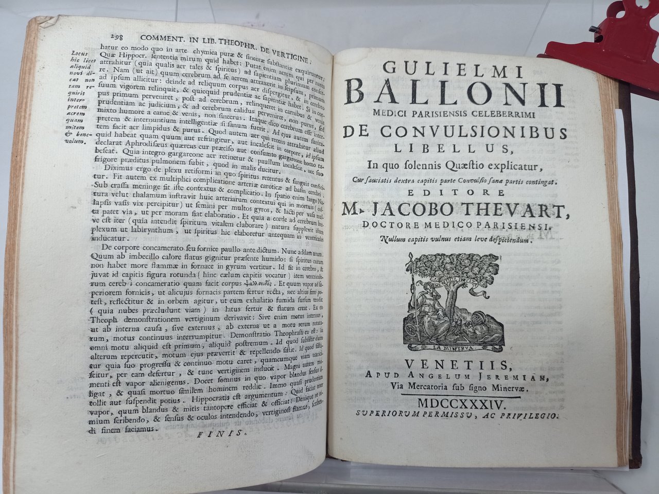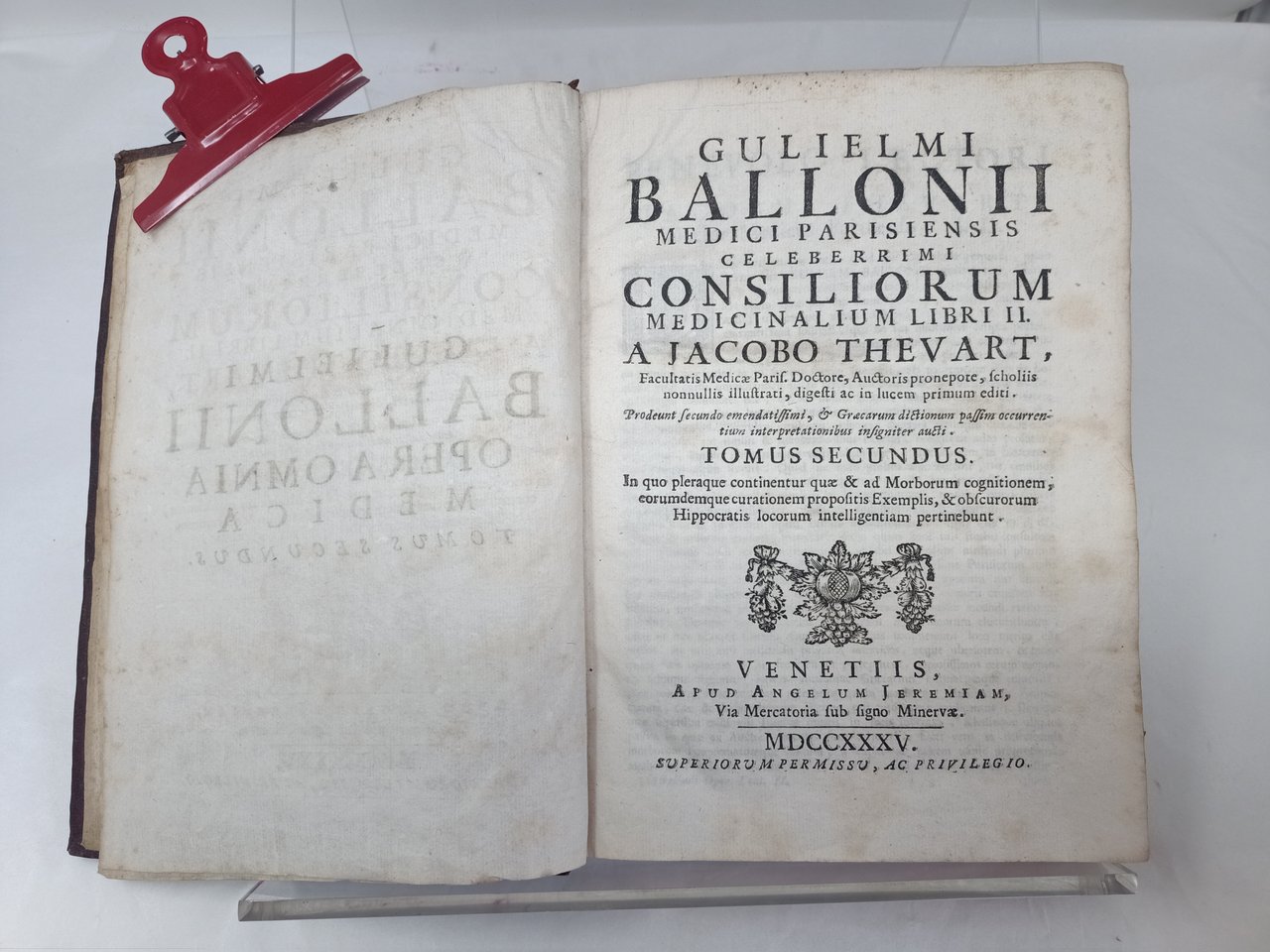 >4 volumi in-4, pp. (28), 392; XII, 470, (2); XVI, 522: XVI, 350. Ritratto inciso f.testo dell'autore nel tomo primo, iniziali, fregi e finalini silografici nel testo. Elegante legatura coeva piena pelle, omogenea per i quattro tomi, dorsi a nervi con fregi in oro. La presente edizione riunisce tutti gli scritti e trattati medici seicenteschi del Baillou (1538-1616, noto medico di Corte di Re Henry IV di Francia). I suoi importanti trattati vennero editi separatamente negli anni tra 1643-1668 in Parigi. Egli fu il primo epidemiologo dei tempi moderni, precedendo le scoperte di Thomas Sydenham, descrisse per primo la pertosse ed a lui si deve il termine “reumatismo”. Non comune vasta opera medico scientifica, in esemplare assai puro. Cfr. Wellcome Medical Library, II, p.87. Garrison Morton, n.60. Krivatsky, 582-591.