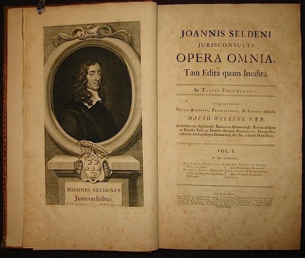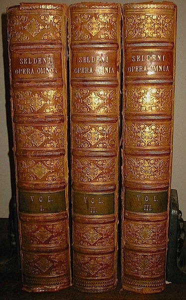 Folio (cm. 45,6), 3 Voll. : Vol. I. 5 cc.nn., XXXIV (Praefatio), 56 pp. (Vita Authoris), 1892 colonne (De anno civili veteris Ecclesiae, seu Reipublicae judaicae Dissertatio), 40 cc.nn. (Indices) con ritratto dell’A. in antiporta; Vol. II. 3 cc.nn., XVIII colonne (Prolegomena), 1721 colonne (De Successionibus in Bona Defunctorum & De Successionibus in Pontificatum Ebraeorum. De Diis Syris. Eutychii Ecclesiae suae Origines. Uxor Ebraica. Analecta Anglo-Britannica. Janus Anglorum. Dissertatio ad Fletam. Judicium de Decem Scriptoribus Anglicanis. Mare Clausum. Vindiciae de Scriptione Maris Clausi. Marmora Arundelliana. Notae in Eadmerum. Epistolae & Poemata), 23 cc.nn.; Vol. III. 4 cc.nn., 2080 colonne (England’s Epinomis. Original of Duels. Titles of Honour. History of Tythes, with the Answers to Sempill, Tilseley, and a Letter to the Marquis of Buchingham. MSS. Of the Passage touching the Number 666. MS. Of Calvin’s Judgment on the Revelations. MS. Of the birth-Day of our Saviour. Of his Purpose and End in Writing the History of Tythes. MS. Of the Jews fometimes living in England. Discours of the Office of Lord Chancellor. Privilege of the Baronage of England. Judicature in Parliament. Of the Original of Ecclesiastical Jurisdiction of Testaments. Letter to Mr. August. Vincent, Rouge-Croix, concerning his Discovery of Errors. Arguments concerning the Baronies of Grey and Ruthen. Ms. Fortescue de Laudibus, &c. and Hengham’s Summa, &c, Speeches in the House of Lords and Commons. MS. Table Talk.), 18 cc.nn. Splendide legature coeve in vitello biondo con ricchi fregi oro ai piatti. Ds. con nervi, ricchi fregi, titolo e numerazione in oro. Tagli colorati. Cerniere dei piatti indebolite o aperte, un piatto staccato. Mancanze alle cuffie e ai margini dei piatti. Ottimi interni.Unica edizione delle opere complete. John Selden, chiamato da Grozio il ‘Genio dell’Inghilterra’, fu uomo politico, giurista e storico di grande rilievo. Egli ebbe vasta parte nella vita pubblica dell’Inghilterra del Secolo XVII.