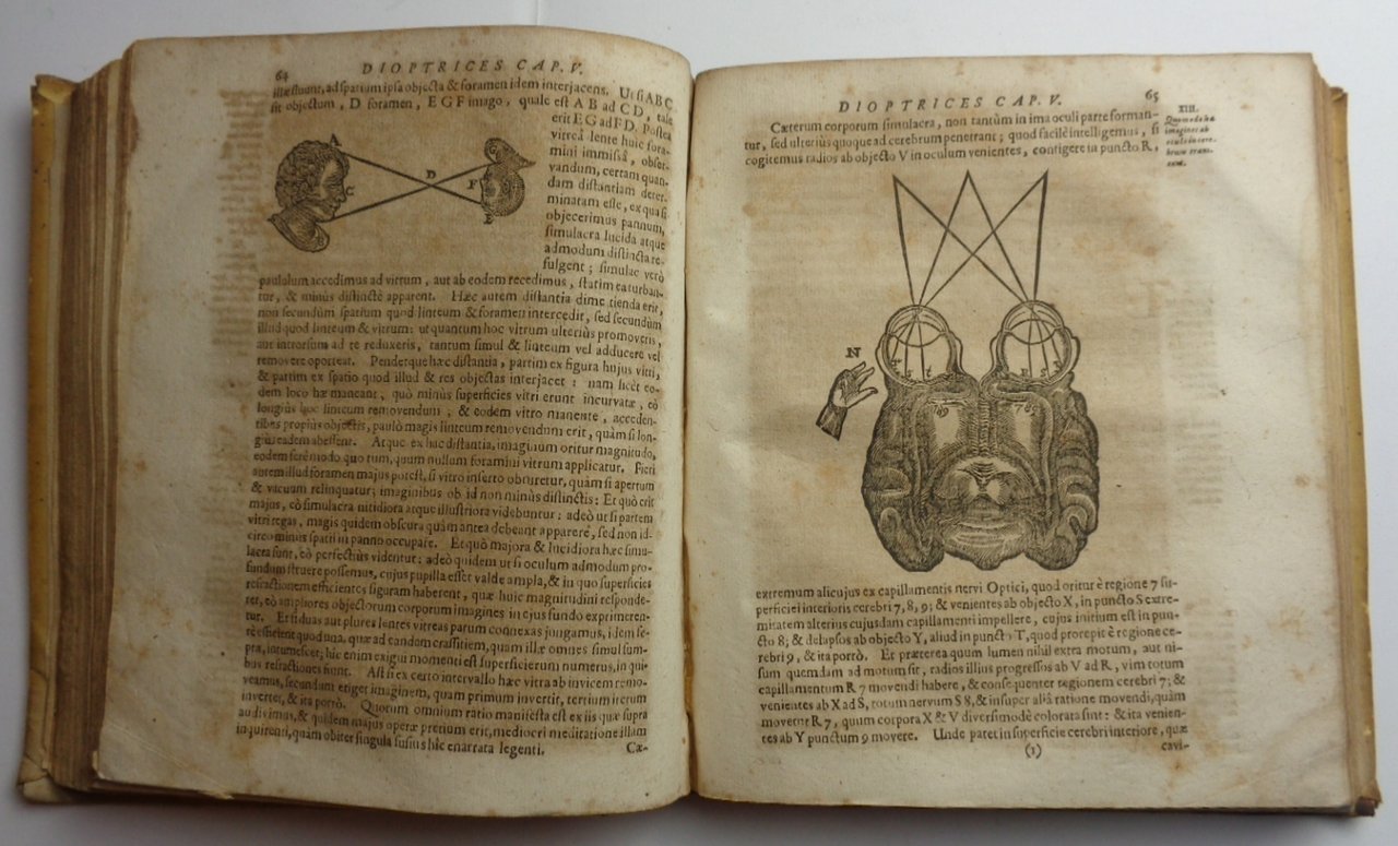 . quibus continentur Meditationes de prima philosophia, Principia philosophiae, Dissertationes de methodo, dioptrice, meteora, & Tractatus de passionibus animae His accessit nova hac editione Tractatus de homine et formatione foetus, cum notis Ludovici de la Forge, authoris Vita, et in fine de quibusdam argumentis annotationes, una cum indice operis hujus universali adjiciuntur . Francofurti ad Moenum, Fridirici Knochii. - - Un volume in 8vo grande (17,5x20 cm), titolo generale in nero e rosso, antiporta incisa con ritratto di Cartesio seduto al tavolo con mappamondi, scheletro e meteorologia agitata (uno strappetto). Contiene, ognuno con proprio frontespizio: - Renati Des-Cartes Principia philosophiae. Editio novissima auctior & emendatior (32)- 168 pagine (Frontespizio con data 1692). Renati Des Cartes Specimina philosophiae: seu Disseratio de methodo rectè regendae rationis, & veritatis in scientiis investigandae: Dioptrice, et Meteora. Ex Gallico translata, & ab auctore perlecta, variiisque in locis emendata (16)- 200 pagine. - Passiones animae, per Renatum Des Cartes: Gallice ab ipso conscriptae, nunc autem in externorum gratiam, Latina ciuitate donatae. (24)- 74- (6) pagine. -Manca rispetto a quanto annunciato nel frontespizio, il Tractatus de Homine et de formatione foetus.-- Segue invece un frontespizio di OPERA PHILOSOPHICA OMNIA in tres tomos distributa (data 1697), poi 26 pp con Nota dell'editore, la Vita di Cartesio (Vitae Renati Des.Cartes brevis descriptio) e l'Index generalis. Poi , senza numerazione, le BREVES ANNOTATIONES AD CONTROVERSA QUAEDAM PHILOSOPHIAE RENATI DES CARTES (72 pp)- Seguono 5 tavole di figure applicate ft. Che si riferiscono al trattato Dioptrice et Meteora (le figure 1 e 7 sono ripetute sia nel testo sia nelle tavole in fine). Bruniture diffuse e insistenti in quasi tutte le parti del libro, per le caratteristiche (purtroppo) della carta olandese. Legatura coeva in piena pergamena con titolo manoscritto al dorso (qualche abrasione al piatto posteriore). - Volume ricomposto e censurato, con l'omissione del Tractatus de Homine e la sua sostituzione con le Breves Adnotationes in polemica con Cartesio. Ma resta anche per questo una notevole testimonianza dell'influenza delle idee cartesiane, della loro diffusione e delle reazioni che suscitarono alla fine del 600. Di queste raccolte di opere di Cartesio ne furono pubblicate numerose, e con composizioni diverse, tra il 1644 e il 1897, da parte di Elsevier, di Blaeu e di Knoch.