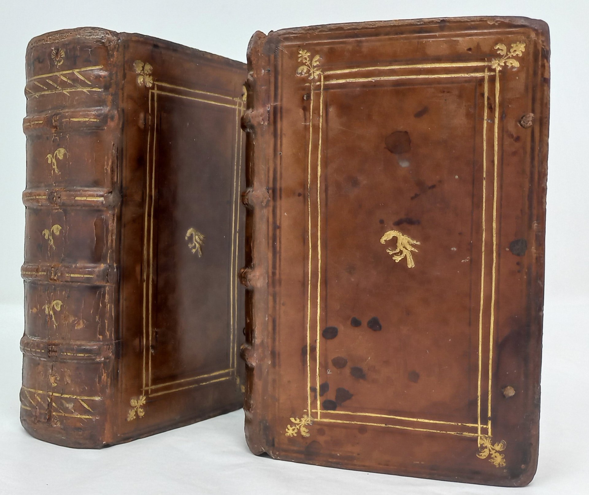 Piccola gora al margine esterno alle ultime carte del primo volume. Brunitura diffusa verso la fine del secondo volume (prima dell'indice) ed una gora al margine esterno limitata a circa 40 carte. Nel complesso buon esemplare, assai bella la legatura con abili restauri alle cerniere e alle cuffie, angoli ammaccati. Gelli "3500 ex-libris italiani" 1820, p. 95.