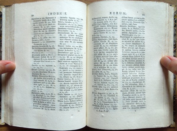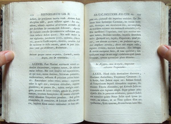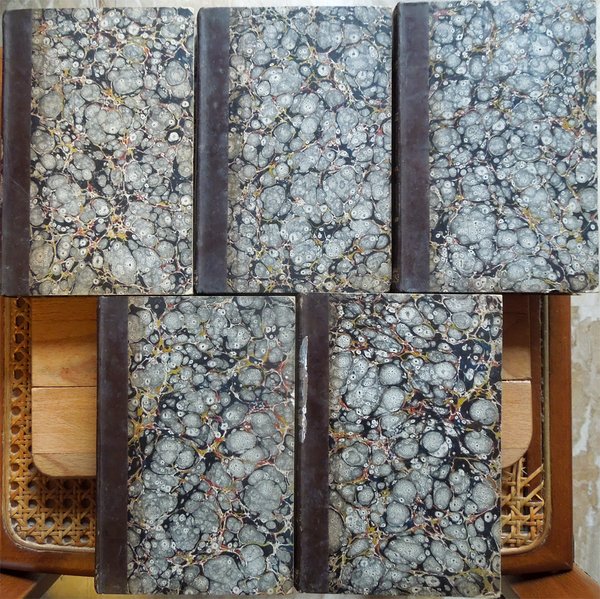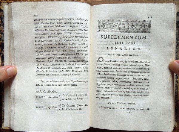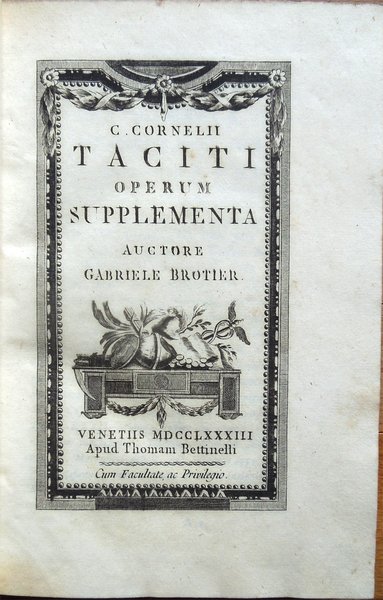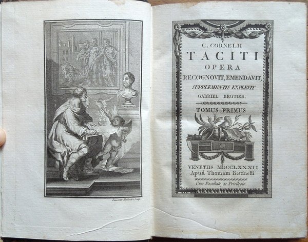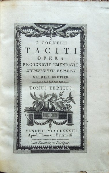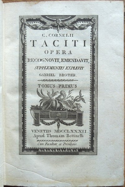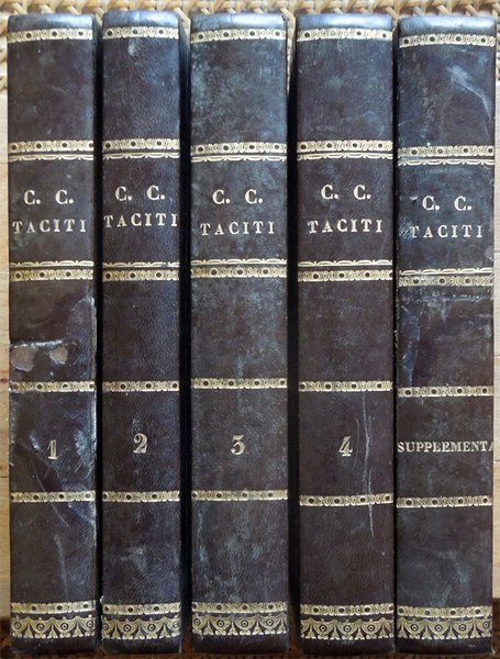 Cinque volumi in-16° (19 x 12,6 cm), pp. XLIII, (1), 392; 344, più una tavola ripiegata contenente Stemma Caesarum in fine; 424; 174, (2), 246 di indici; 440, legatura coeva in mezza pelle con angoli in pergamena, dorsi a 5 scomparti con titoli e fregi in oro. Frontespizi incorniciati, bella incisione in rame all'antiporta del primo volume. Nel primo volume, nella parte centrale del dorso, due piccole abrasioni; sempre al primo volume, nella parte centrale del piatto posteriore, un'abrasione alla carta e alla pelle, di complessivi centimetri 1 di altezza per 12,7 di larghezza (l'intera larghezza del piatto). Al piatto posteriore del quarto volume, nella parte inferiore della striscia in pelle che lo riveste parzialmente, mancanza, di centimetri 4 di altezza x 1,3 circa di larghezza, ben reintegrata da intervento di restauro. Preziosa ed elegante edizione. Nota di spedizione: il peso complessivo dei volumi, debitamente imballati per l'invio, supera i 2 chilogrammi. Indice. Tomus I. Annales I-VI. Tomus II. Annales, XI-XVI. Tomus III. Historiae. Tomus IV. De situ, moribus et populis Germaniae; De vita Cn. Julii Agricolae; Dialogus de oratoribus. Supplementa. Annales, V, VII-XI, XVI; Historiae, V; Appendix chronologica auctore Gabriele Brotier.