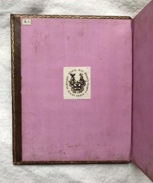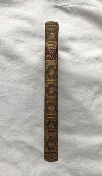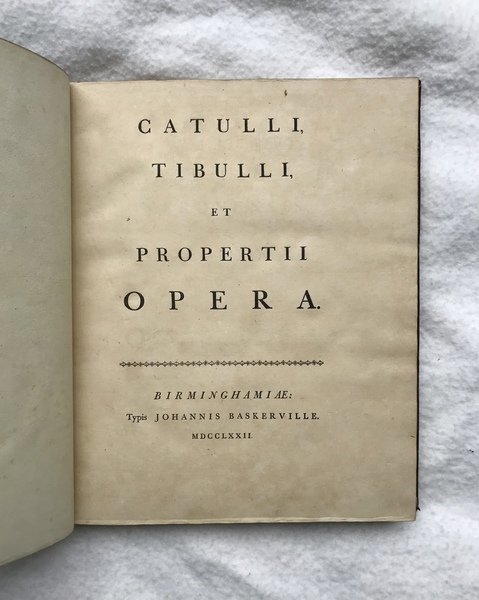 CATULLUS; TIBULLUS; PROPERTIUS. BASKERVILLE PRESS. Opera. Birmingham, Typis Joannis Baskerville, 1772. FIRST BASKERVILLE EDITION. 4to, pp. (2) 372. Mottled calf gilt, boards framed by Greek key patterns, inner dentelles and title tooled on red morocco label to richly decorated spine. A.e.g., pink silk ribbon bookmark and pink endpapers with bookplate (coat of arms and motto “est melius clarum fieri, quam tempore nasci”) and another small paper label with initials “A. V.”. Just a few light scratches on the boards. A near fine copy in a luxurious binding. A22