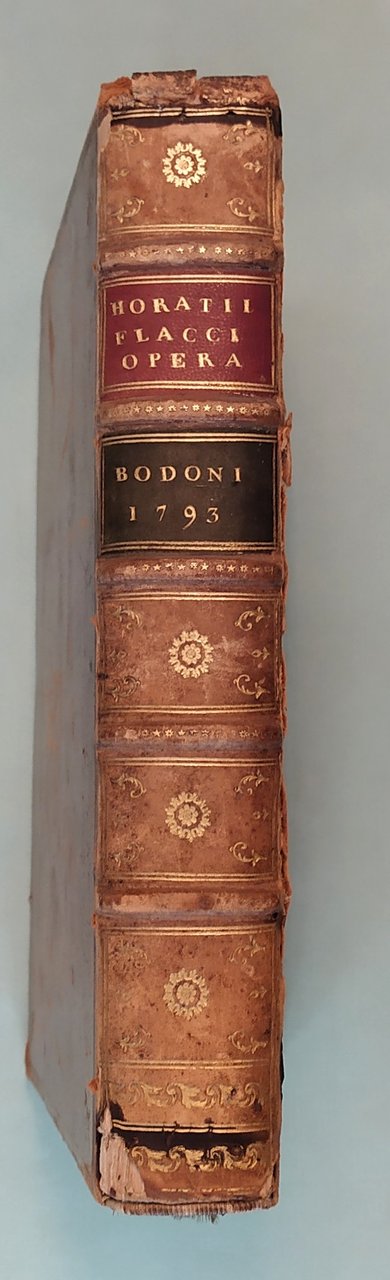 Opera. Parmae, in Aedibus Palatinis Typis Bodonianis, 1793. In 4to (cm.30x23); cc.2n.nn., la prima bianca; pp.XV, una n.n. con occhietto, pp.371. Bella legatura coeva in pelle, piatti inquadrati da fergi dorati, motivi floreali agli angoli, abrasioni al piatto posteriore. Dorso a cordoni con doppio tassello con titoli e fregi in oro. Brooks, 493.