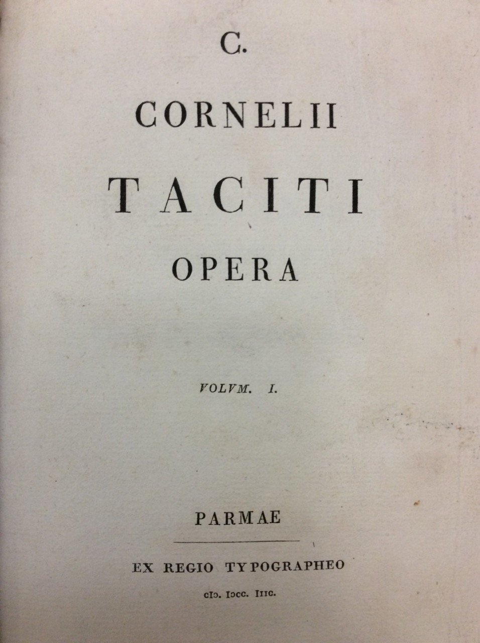 In-8 p. (mm. 225x150), 2 volumi, mz. pergamena con ang. ottocentesca (risg. rifatti), pp. (4),XII,(4),376; (4),328; dedica a Ferdinando di Borbone Hispaniarum infanti, Regio Parmensium Duci, etc. etc. Il primo vol. di questa ediz. bodoniana contiene i Libri I. II. III. IV. V. VI degli Annali; il secondo i Libri XI. XII. XIII. XIV. XV. XVI.Cfr. Brooks, 692 - Brunet, V, 638 cita l'ediz. degli Annali del 1795 (Bodoni) in 3 volumi in folio e aggiunge anche: l'imprimerie royale de Parme a donné. en 1797, une édition latine des Annales de Tacite, en 2 vol.. Con lievi aloni o tracce d'uso ma buon esemplare marginoso, con barbe..