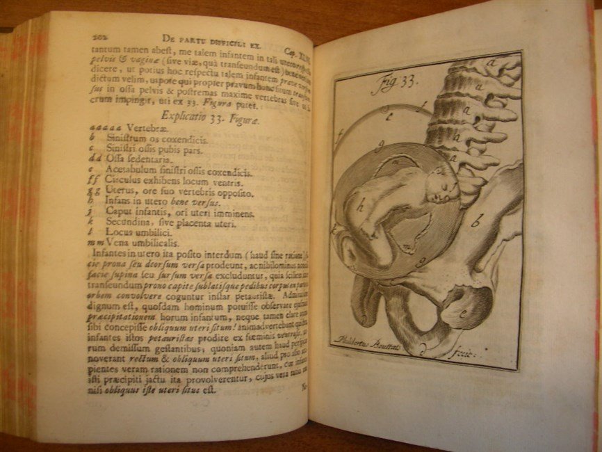 2 parti in un vol. in-4, pp. [16], 320, [2]; [10], 67, [9], leg. p. pelle coeva con ricchi fregi e tit. oro al d. Tagli rossi. Antip. con ritr. dell’A. inc. in rame. Con 36 tavv. anatomiche, alcune ripiegate. Castiglioni p. 561: ". degli ostetrici olandesi i più noti furono Ruysch e Henrick van Deventer (1651-1724) che fu iniziatore degli studi sul meccanismo del parto". Wellcome II, 460. Qualche spellatura alla leg., qualche pag. brun. [078]