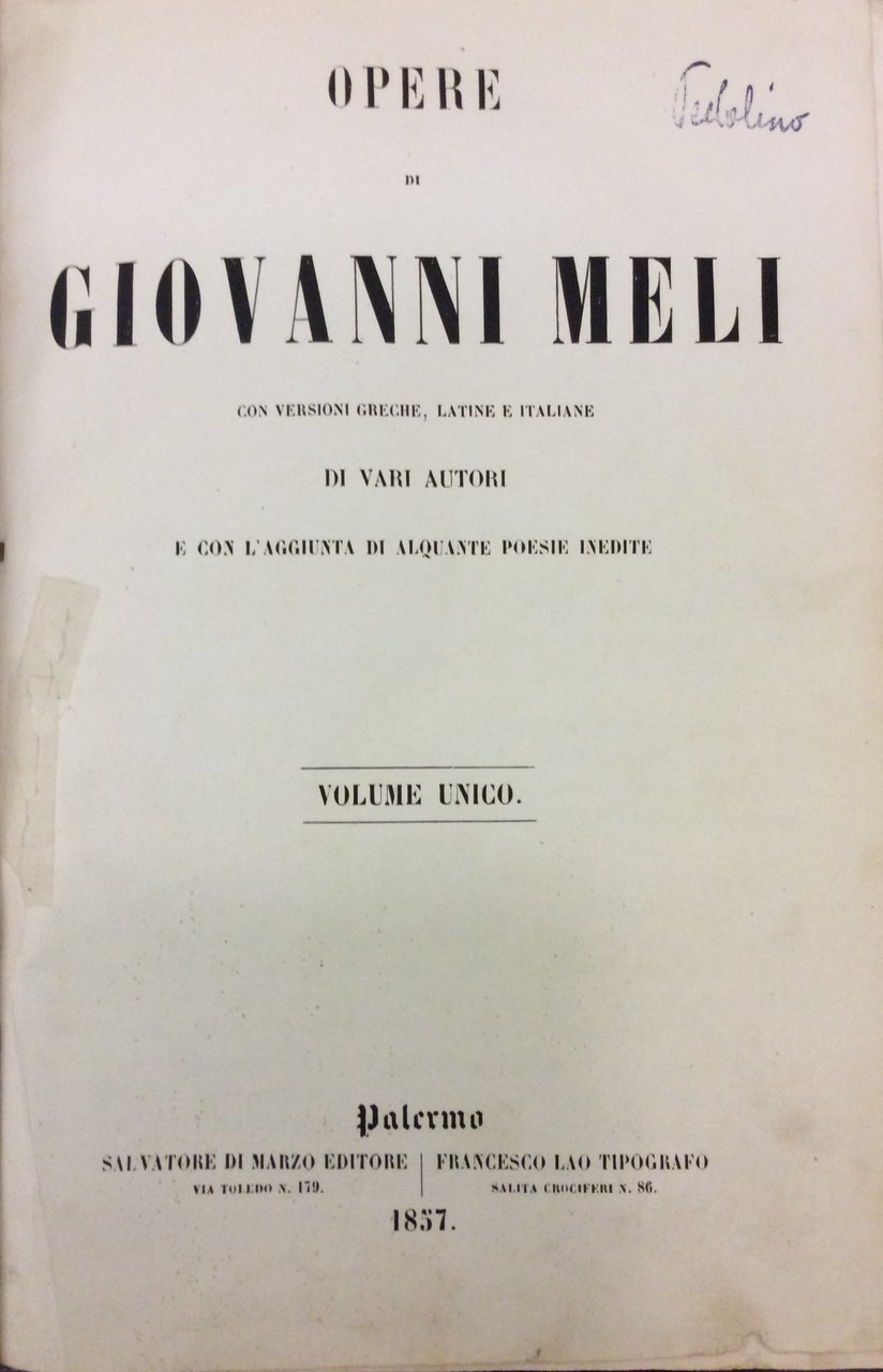 In-8 (mm. 236x158), mz. pelle coeva (risg. rifatti), decoraz. e titolo oro al dorso, pp. 551, XXXVII (di Indice), testo su due colonne, con un ritratto dell'A. in litografia. Le ultime 37 pp. si riferiscono alle Osservazioni grammaticali' ed al Dizionario delle voci e maniere oscure siciliane adoperate dall'A'.Introdotte da un Discorso intorno Giovanni Meli e le sue poesie di G. Di Marzo e da Cenni sopra Meli tratti dalla storia della letteratura italiana di P. Emiliani-Giudici, le opere sono divise in tre parti: Lirica - Poemi - Prose. Vi si trova anche la traduzione latina della Bucolica fatta da Vincenzo Raimondi ed un saggio di traduzione greca di alcune anacreontiche del Meli, di Monsignor G. Crispi. Tra le Prose anche Le Riflessioni sul meccanismo della Natura e Gli effetti straordinari del veleno di un ragnatello pubblicate la prima volta nel 1777. Delle opere del Meli furono fatte numerose edizioni e traduzioni.Cfr. Moncada Lo Giudice,1418 per l'ediz. del 1838 - Mira,II, p. 68 che definisce l'A. Onore di Sicilia, d'Italia e di Europa. Nacque questo immortale poeta siciliano in Palermo nel 1740 e morì nel 1815; fu in vita onorato dai più grandi poeti e letterati del suo tempo - Fera /Morlicchio,II,197: Raro volume ottocentesco.Con fiorit., aloni, e numerose postille a matita; mancano le pp. 155-156, qui manoscritte.