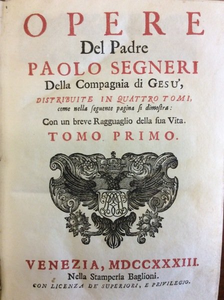 In-8 p. (mm. 225x163), 4 volumi, mz. pelle ottocentesca, fregi e titolo oro al dorso, pp. (6),62,(2),821; (12),672; (12),295,216,354,(34); (8),751; frontespizio del 1° volume stampato in rosso e nero; ornati da testatine e grandi iniz. inc. su legno, e con un ritratto dell'Autore inc. in rame; testo su due colonne. Vi sono contenute: "La Manna dell'Anima.. - Il Quaresimale.. - Il Cristiano istruito nella sua legge - L'incredulo senza scusa..". Cfr. Gamba,909 - Piantanida,4873 - Graesse,VI,340 - Brunet,V,260 che citano le numer. ediz. delle sue opere. "Grande fu la fama del gesuita Paolo Segneri (1624-94) come predicatore. Letterariamente le sue prediche sono pregevoli.. e notevoli anche i discorsi morali". Cosi' Diz. Treccani,XI, p. 91. Qualche fiorit. o arross. interc. nel testo, ma complessivam. esemplare in buono stato.