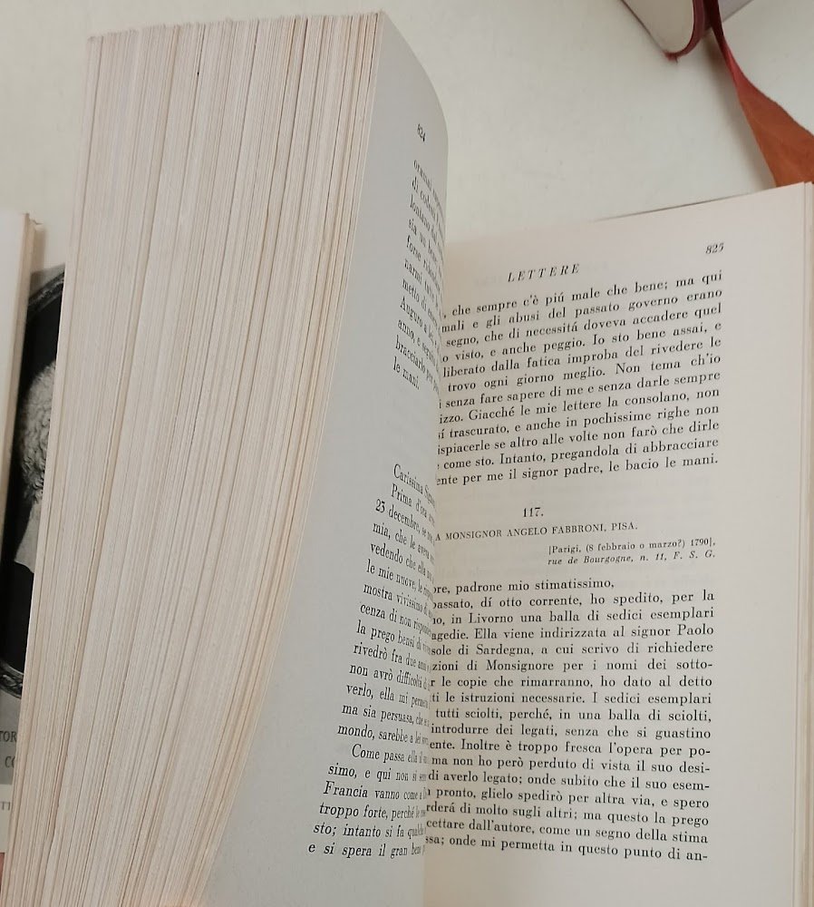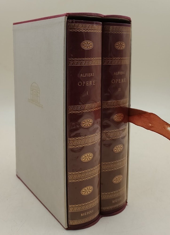 2 voll. in cofanetto, in 8', leg. ed. sovrac. in acetato, pp. 677+1060, ritratto in n. in antiporta su entrambe i volumi: Vol. I. Odi e sonetti, dei sepolcri, lettera a monsieur Guillon, le grazie, di un antico inno alle grazie, poesie minori, aiace, ultime lettere a Jacopo Ortis, viaggio sentimentale, con 4 illustrazioni; vol. II. -prose polemiche e critiche: Orazione a Bonaparte, orazione inaugurale, ragguaglio d'un adunanza dell'Accademia de' Pitagorici, Hypercalypsis, saggio sullo stato della letteratura italiana nel primo ventennio del secolo decimonono, saggi sul Petrarca, discorso storico sul testo del Decamerone, discorso sul testo della Commedia di Dante, con 4 illustrazioni, a cura di Guido Bezzzola, prima edizione.