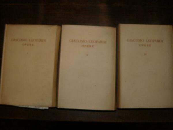 Tre volumi in -8°, pp. 842, 1021, 1013, 52 tavole f.t., cartonature editoriali con titoli ai dorsi e ai piatti ant. Interessante raccolta delle opere di Leopardi nella collana dei classici Rizzoli diretta da Ugo Ojetti e così suddivise: vol.I: Canti. Operette morali. Appendice alle operette morali. Martirio de' Santi Padri. Volgarizzamenti. Pensieri. Paralipomeni della Batracomiomachia. Vol.II: Scritti vari. Lettere. Vol.III: Zibaldone scelto.
