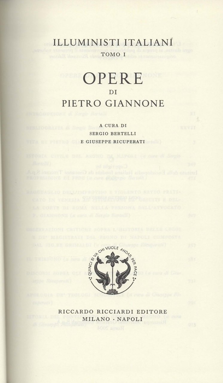 In 8°, mp. edit., pp. XL, 1240, (4), coll. "Letteratura italiana. Storia e testi. Illuministi italiani. Volume 46 - Tomo I", originariamente edito nel 1971 da Ricciardi e qui riproposto dall'Istituto della Enciclopedia Italiana - Treccani, ottimo es.