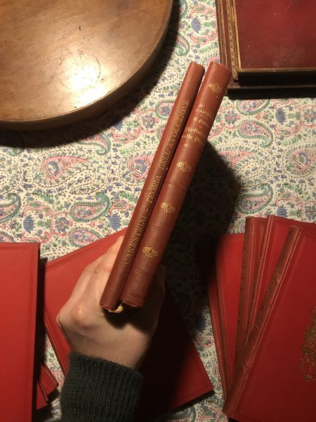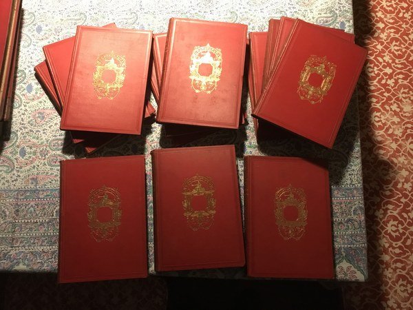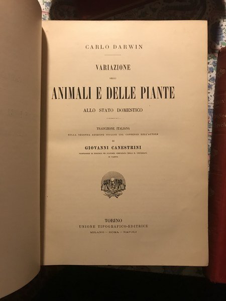 In-8° moderno. 15 volumi in tela editoriale rossa e fregi in oro della legatoria Fratelli Fornara e Vigliani di Torino. Antiporta con ritratto dell’autore a piena pagina al volume sui banchi di corallo, alcuni volumi illustrati nel testo e con belle tavole fuori testo, alcune delle quali a colori e ripiegate più volte. Ex libris del Dott. Luigi Maccagno, sia a timbro che manoscritto, alle sguardie e occasionalmente al margine bianco dei frontespizi, o di una delle prime pagine. Volume sull’espressione dei sentimenti con vecchia dedica a penna. Sguardie editoriali di carta rossa tranne per il volume sulla formazione della terra vegetale, che presenta sguardie di carta decorativa. Legature in condizioni eccellenti, solo qualche leggero segno di usura alle cuffie ed angoli in alcuni volumi. Ottimo set pubblicato da UTET della traduzione italiana delle opere di Darwin autorizzata dall’autore, in 13 voll., di cui 11 in prima edizione, 1 in seconda ed 1 in terza tiratura, a cui si aggiungono altri 2 voll. in seconda edizione sulla teoria dell’evoluzione, scritti da Giovanni Canestrini, il curatore di quest’impresa editoriale. Collana meravigliosa in legatura originale, quasi tutta in prima edizione, degli importanti lavori del grande naturalista inglese Charles Darwin.