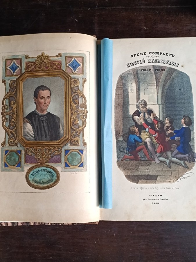<span style="font-style: normal;">2 volumi in-8° (cm. 26,6), legature coeve in mezza percallina bruna, dorsi lisci con titolo in oro e filetti a secco (tracce d'usura alla cerniera del solo vol. I), piatti marmorizzati, tagli spruzzati in blu; pp. XL 1234 [4] a numerazione continua, in stato molto buono; con 79 (di 81) bellissime tavole litografiche dipinte a colori a mano fuori testo, di cui 1 ritratto del Machiavelli all'antiporta e 1 frontespizio; alcune fioriture sparse. Elegante e non comune edizione illustrata di questa raccolta machiavelliana; priva delle sole due tavole di Sisto IV e Ferruccio (secondo la </span><i>Guida pel legatore</i> in fine). Buon esemplare. (NA10)