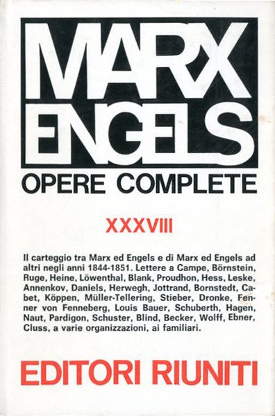 VIII, 734 p. ; 22 x 15 cm. Opere di Marx ed Engels, 38. Il carteggio tra Marx ed Engels e di Marx ed Engels ad altri negli anni 1844-1851. Il presente volume è stato curato da Mazzino Montinari. . Legatura editoriale, coperta in tela verde con impresso il titolo in oro al dorso, muto il piatto, sovraccoperta a colori patinata lucida. Codice libreria 784.