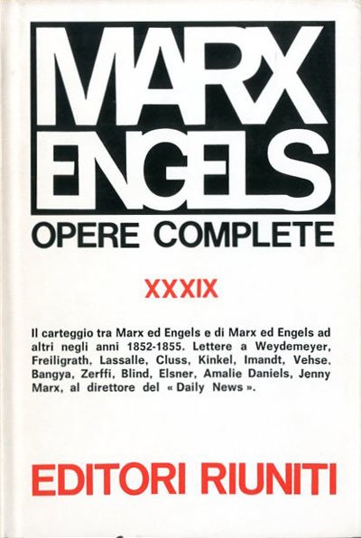 845 p. ; 22 x 15 cm. Opere di Marx ed Engels, 39. Il carteggio tra Marx ed Engels e di Marx ed Engels ad altri negli anni 1852-1855. Il presente volume è stato curato da Mazzino Montinari. . Legatura editoriale, coperta in tela verde con impresso il titolo in oro al dorso, muto il piatto, sovraccoperta a colori patinata lucida. Codice libreria 785.