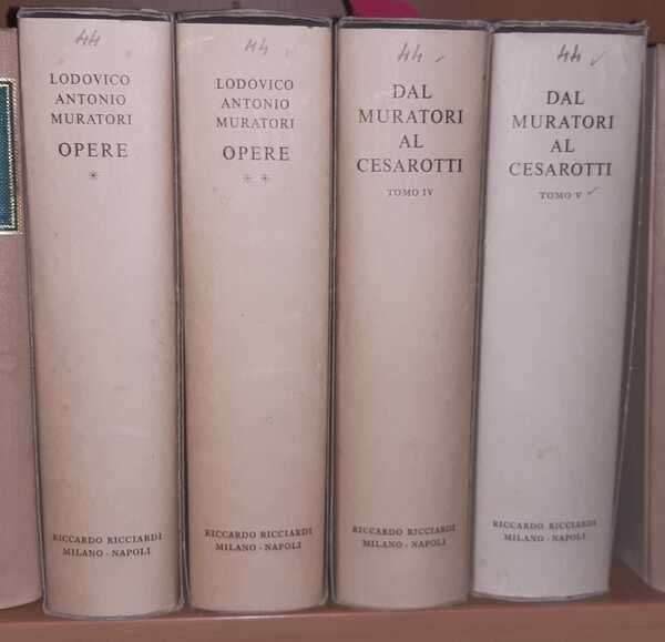 4 volumi. Ottavo (23 x 14,5 cm). 1) 1013; 2) 1014-2019; 3) 1180; 4) 1197. Legature editoriali in tutta tela con titolo in oro al dorso su tassello, con segnacolo. Sovraccoperte editoriali a stampa conservate recanti, all’estremità superiore dei dorsi, numeretto manoscritto di collocazione a scaffale. Esemplare completo degli astucci cartonati editoriali. In buono stato di conservazione. Primi due volumi sono le Opere del Muratori a cura di Giorgio Falco e Fiorenzo Forti. Terzo e quarto volume, con titolo Dal Muratori al Cesarotti. Collana diretta da Raffaele Mattioli, Pietro Pancrazi, Alfredo Schiaffini.