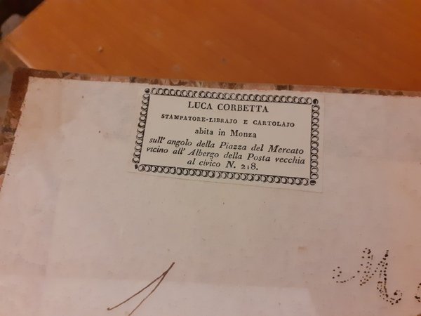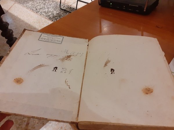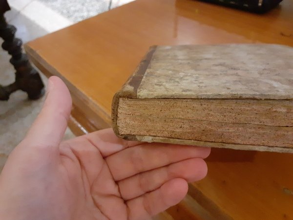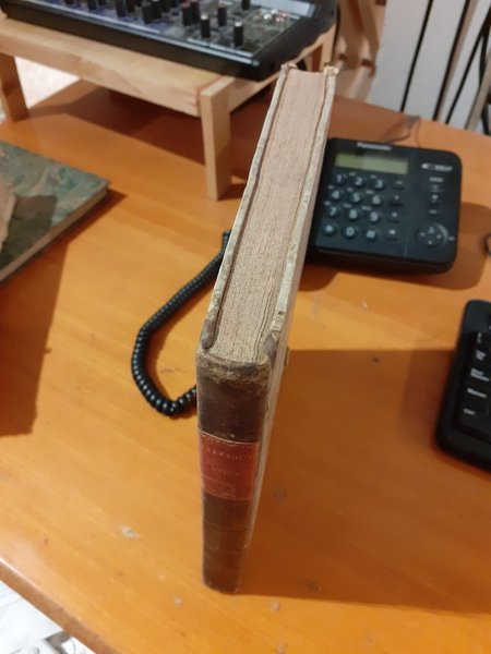 Legatura coeva mezza pergamena con angoli e piatti in cartonato con decorazione floreale, titolo oro su tassello al dorso ingiallito e scurito dal tempo, con piccole abrasioni e segni da uso; molte fioriture e aloni da umido ai risguardi meno intense nelle pagine ben leggibili con tagli tinti rosso, piccole mancanze nei margini inferiori di alcuni fogli.
