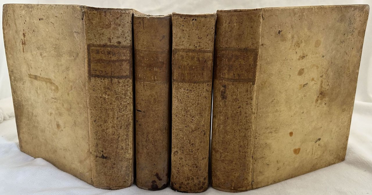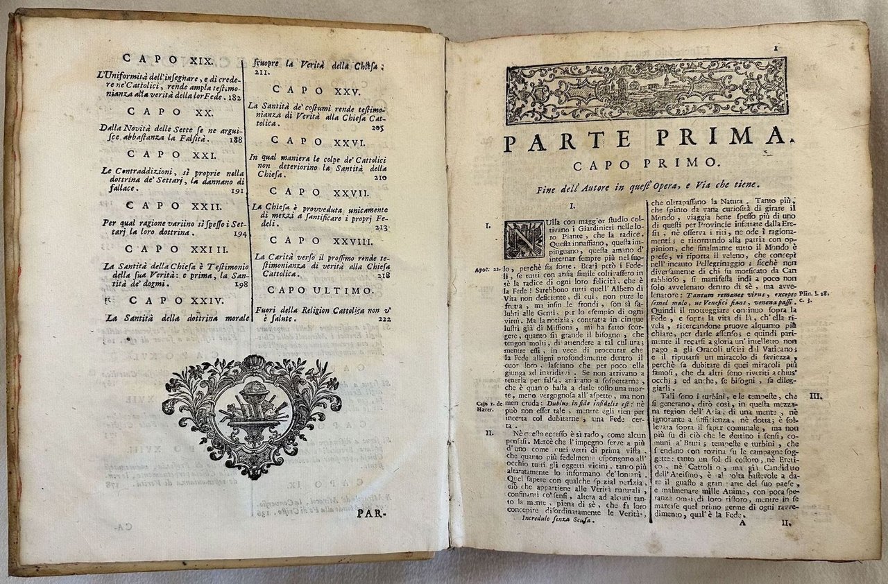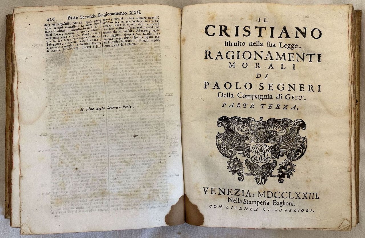 Edizione veneziana del 1773 di questa raccolta di opere di Paolo Segneri (1624-1694). L'opera è composta da quattro tomi ed è completa. All'interno le seguenti opere: Vita dell'autore, La Manna dell'anima, Meditazioni, Esposizione del Miserere, La pratica di stare interamente raccolto con Dio, I cinque venerdi di Santa Maria Maddalena de Pazzi, Quaresimale, Le Prediche dette nel Palazzo Apostolico, Panegirici Sacri, Il Cristiano istruito nella sua legge, L'incredulo senza scusa, La concordia tra la Fatica e la quiete, La lettera di risposta, I sette principi, Fascetto di vari dubbi, Il Divoto di Maria vergine, Il Parroco Istruito, Il Confessore istruito, Il penitente istruito, Il penitente istruito a ben confessarsi, LAude Spirituale, Il Magnificat, Lettere su la materia del probabile. Nell'opera "L'incredulo senza scusa" dimostra la vera religione cristiana e nelle sue dissertazioni parla anche dell'astrologia, l'immortalità dell'anima, i miracoli, gli ebrei, eretici, le sette, le profezie.<BR><BR>Ritratto di Segneri inciso da Geronimo Rossi alla carta 8 n.n. Bei capilettera disegnati. Tagli marmorizzati. Antiche note manoscritte. In buone condizioni. Copertina in piena pergamena coeva in buone condizioni generali con lievi usure ai margini e dorso. Legatura in buone condizioni. Pagine in buone condizioni con fioriture. Gore d'umidità nei tomi 2, 3,4 in particolare nel volume terzo che presenta anche una brunitura al margine inferiore. In 8. cm 24x18,5. Pp. (8)+798, (12)+672, (6)+295+(1)+216+382, (8)+854. Peso Kg. 5.Venetian edition of 1773 of this collection of works by Paolo Segneri (1624-1694).The work is made up of four tomes and it is complete. Insdie the following works: Life of the author, La Manna dell'anima, Meditazioni, Esposizione del Miserere, La pratica di stare interamente raccolto con Dio, I cinque venerdi di Santa Maria Maddalena de Pazzi, Quaresimale, Le Prediche dette nel Palazzo Apostolico, Panegirici Sacri, Il Cristiano istruito nella sua legge, L'incredulo senza scusa, La concordia tra la Fatica e la quiete, La lettera di risposta, I sette principi, Fascetto di vari dubbi, Il Divoto di Maria vergine, Il Parroco Istruito, Il Confessore istruito, Il penitente istruito, Il penitente istruito a ben confessarsi, LAude Spirituale, Il Magnificat, Lettere su la materia del probabile. Portrait of Segneri engraved by Geronimo Rossi in page 8 n.n. Beautiful decorated capital letters. External marbled edges. Antique handwritten notes. In good conditions. Parchment coeval cover in good conditions lightly worn in the extremities. Binding in good conditions. Pages in good conditions with foxing. Dump stains in tome 2, 3,4 in particular in third volume which has a yellowing in the foot edge. In 8. cm 24x18,5. Pp. (8)+798, (12)+672, (6)+295+(1)+216+382, (8)+854. Weight Kg. 5.