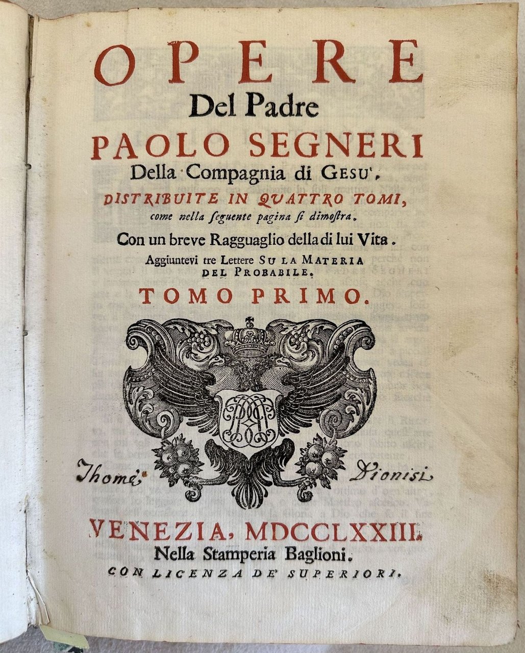 OPERE DEL PADRE PAOLO SEGNERI DELLA COMPAGNIA DI GESU DISTRIBUITE IN QUATTRO TOMI CON UN BREVE RAGGUAGLIO DELLA DI LUI VITA