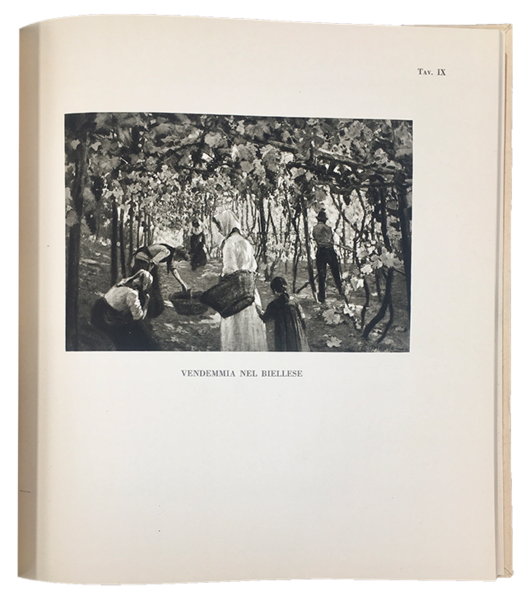 In-8° quadrotto (cm. 24,5x22,6), pp. (12) + 30 TAVOLE seppia f.t. Bross. edit. con sovracc. a fodera stampata; es. munito di due cartoncini edit. apposti a protezione delle sguardie. Introd con lettera in fac-simile di Leonardo BISTOLFI. BOZZALLA (POLLONE 1874-1958) allievo di Grosso, ma con tecnica tutta sua; prima ispirato dalla vigoria virile, poi, influenzato da Lorenzo Delleani, al paesaggio. Rara monografia dell'artista BIELLESE, censita da ICCU in sole 3 bibl. Es. perfetto.