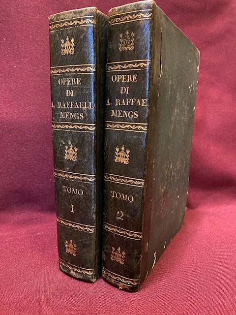 Opera completa in due volumi con legature coeve in mezza pelle verde, titoli ed eleganti fregi in oro al dorso, stampati su carta pesante, freschissimi, segnacolo in seta rosa originale, ottimi esemplari senza difetti. Medaglioni incisi in rame ai due frontespizi. Bella edizione in cui vengono raccolti gli scritti del pittore boemo e che rappresentano la migliore spiegazione della sua opera. Ad esempio l'ammirazione verso Raffaello ed il Correggio al cui primo Mengs dava il primato per il disegno e l'espressione ed al secondo per la grazia e per il chiaroscuro. Sono contenuti nell'opera: RIFLESSIONI SOPRA I TRE GRAN PITTORI RAFFAELLO, CORREGGIO, E TIZIANO, E SOPRA GLI ANTICHI; LEZIONI PRATICHE DI PITTURE. Sc. P.