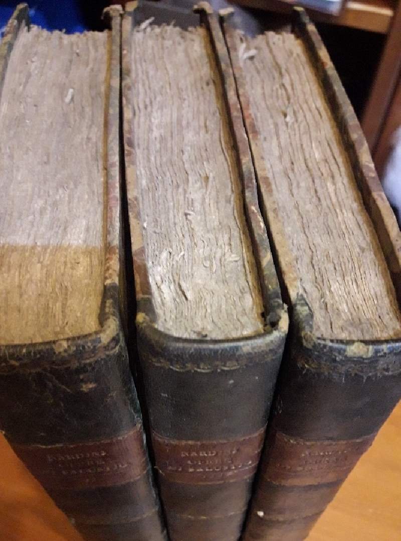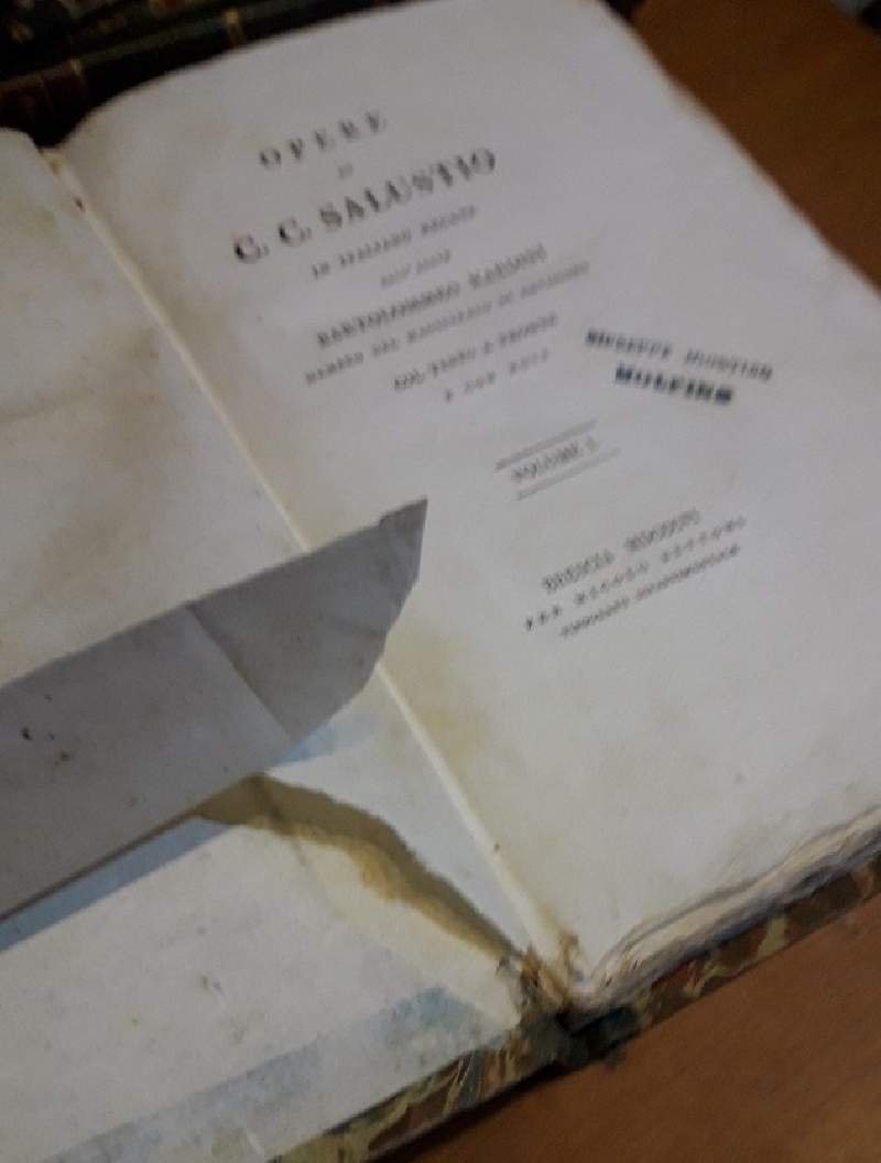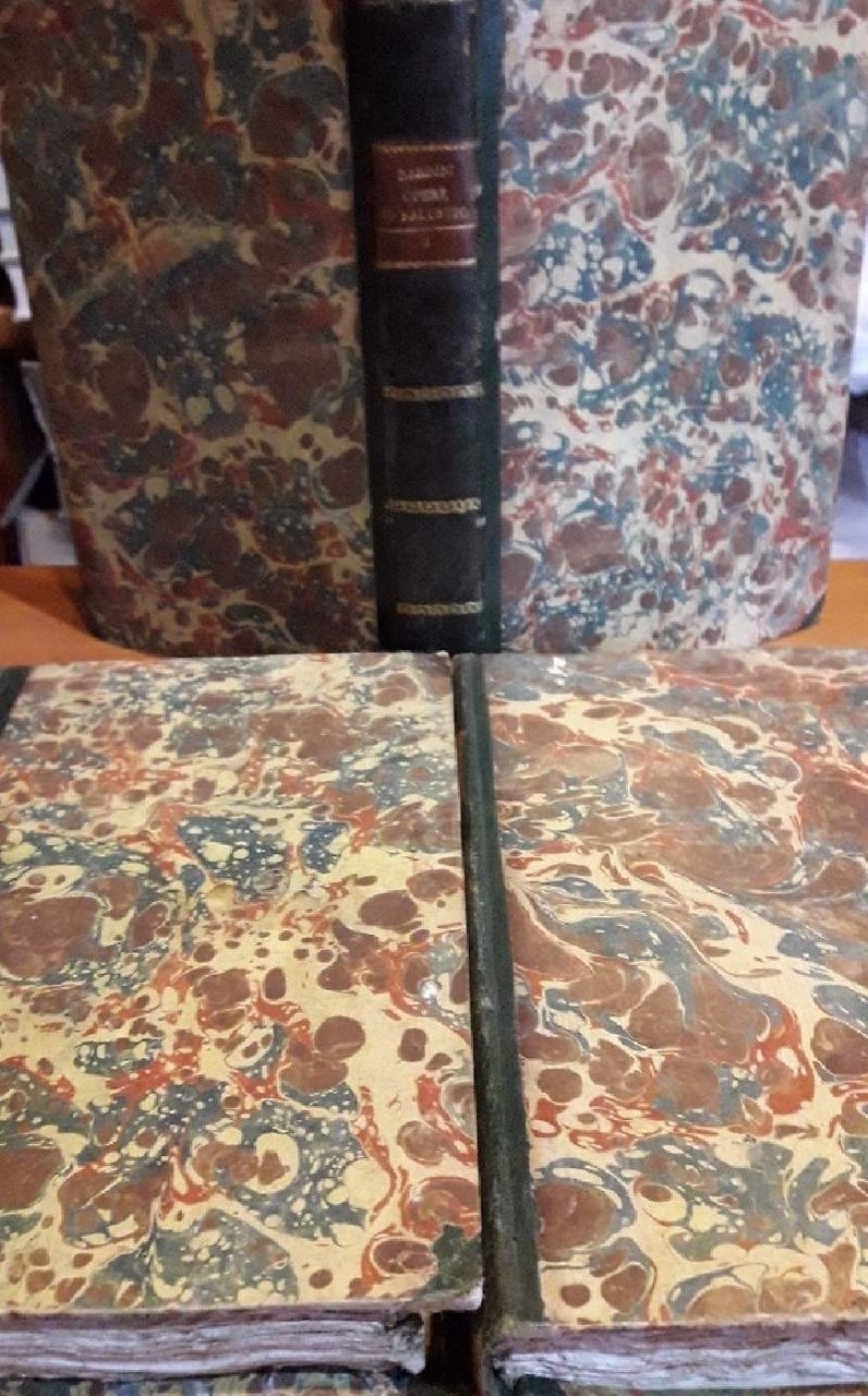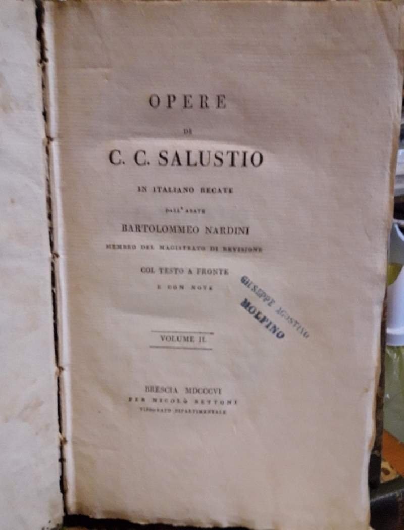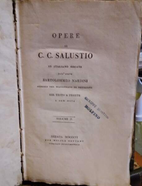 Tre volumi in 8'. Legat. in m. marocchino coevo, pp 246, 340, 236. Bell'esemplare con i tagli marmorizzati.Timbro appartenenza ai frontespizi, strappo alla prima bianca del I vol. Opere di C.C. Salustio in italiano recate dall'Abate Bartolommeo Nardini membro del magistrato di revisione col testo a fronte e con note. Luogo di pubblicazione BresciaEditore Nicolo' BettoniAnno pubblicazione 1806Materia/Argomento Letteratura Latina ***Due to bureaucratic reasons, books dated over 70 years old cannot be immediately exported, please contact us before placing the order.***