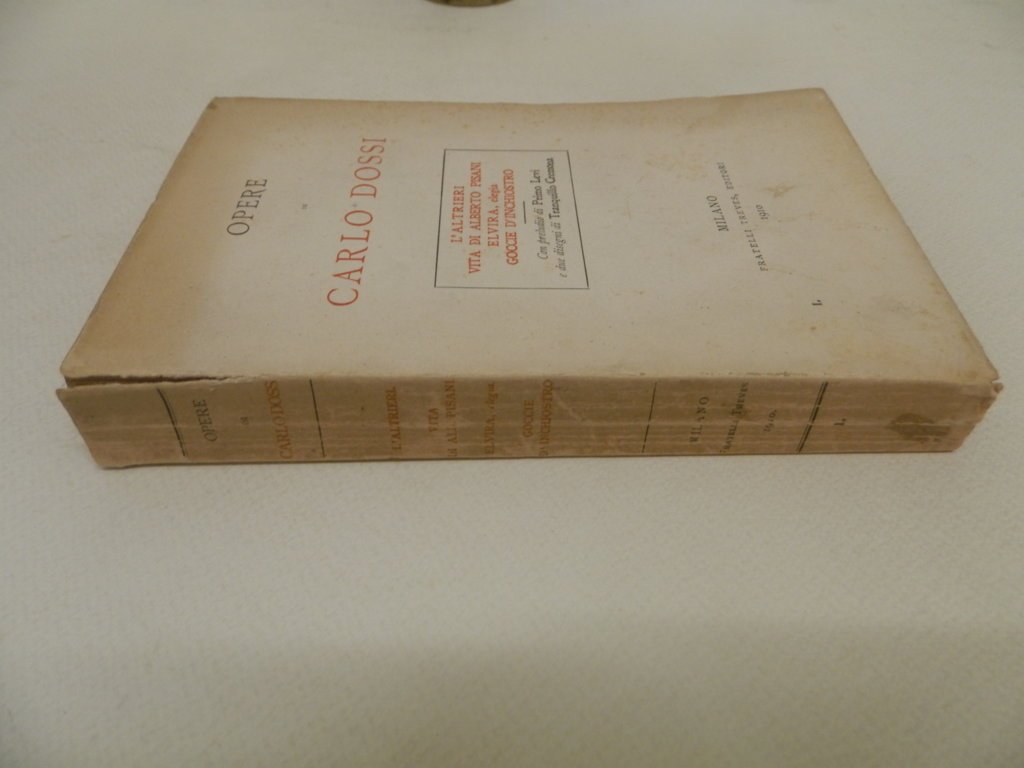 16°, mm 195x125, pp. XXIV, 359, brossura editoriale con titolo in rosso e nero, buona copia, allentata al cuffia superiore, minime bruniture e aloni alla brossura. Ritratto di Dossi in antiporta, un preludio di Primo Levi e due disegni di Tranquillo Cremona. Contiene L'Altrieri, Vita di Alberto Pisani, Elvira, Gioccie d'inchiostro. Primo dei cinque volumi delle opere. . *** TUTTI I NOSTRI LIBRI SONO VISIBILI PREVIO CONTATTO MAIL O TELEFONO NELLA NUOVA SEDE DI MILANO: LIBRERIA COSMOPOLIS, VIA JOMMELLI, 22. ***