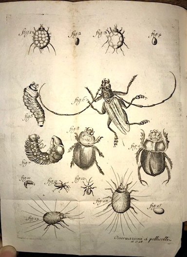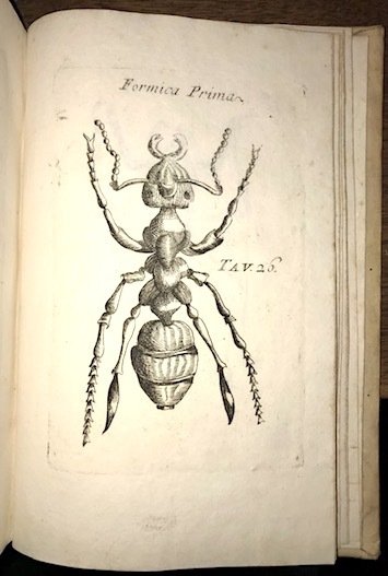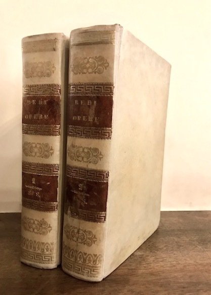 8vo (cm. 20), 2 Voll. (di 3). Primo volume: 26 pp., 39(1) pp. con una tav. ripiegata; 1 c.nn., 204 pp. con 9 ill.ni n.t. (di cui 8 a piena pagina), 1 c.nn., 223(1) pp., 54 pp. con una tav. ripiegata, 1 c.nn., 26 tavv. numerate (di cui 2 ripiegate); secondo volume: 3 cc.nn., 133(1) pp., 1 c.nn., 144 pp., 220 pp., 2 cc.nn., 51(1) pp., 29 tavv. numerate, 6 tavv. numerate. Legature coeve in pergamena rigida con fregi e titoli oro su doppio tassello al ds. Ex libris ai contropiatti anteriori. Timbretto di appartenenza sulle carte d’occhietto, altro di bibl. privata estinta sui frontespizi. Esemplare assai fresco ed in ottimo stato di conservazione (purtroppo mancante del terzo ed ultimo volume) di questa prima edizione collettiva delle opere del Redi.Il primo volume contiene: Vita di Francesco Redi scritta dall’Ab. Salvino Salvini, Orazion delle Lodi di Francesco Redi recitata nel suo funerale dal Sig. Anton-Maria Salvini, Esperienze intorno alla Generazione degl’Insetti, Osservazioni intorno agli animali viventi che si trovano negli animali viventi, Osservazioni intorno a’ Pellicelli del corpo umano, Lettera del Sig. Giacinto Cestoni al Sig. Antonio Vallisnieri, Miglioramenti e correzioni d’alcune esperienze e osservazioni del Redi fatte dal Sig. Antonio Vallisnieri.Il secondo volume contiene: Esperienze intorno a diverse cose naturali e particolarmente a quelle che ci son portate dall’Indie, Osservazioni intorno alle vipere, Lettera sopra alcune opposizioni fatte alle Osservazioni intorno alle vipere, Osservazioni intorno a quelle gocciole e fili di vetro che rotte in qualsisia parte tutte quante si stritolano, Esperienze intorno a quell’acqua che si dice che stagna subito tutti quanti i flussi del sangue che sgorgano da qualsisia parte del corpo, Lettera intorno all’invenzione degli occhiali, Esperienze intorno a’ Sali fattizj, Lettera del Sig. Tommaso Platt d’alcune esperienze intorno al veleno delle vipere, Lettere, Etimologie italiane.
