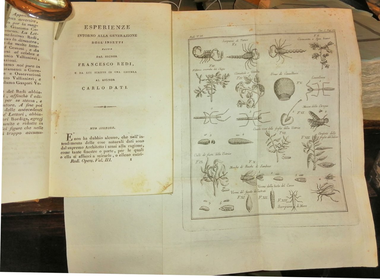 In-8 (20 cm) 9 voll. (1) c. (di ritratto) LIII (3) 370 (2); 285 (1); VIII V c. (di tav.) 492 (2); 491 (1) c. ( di tav) (1); (2) 408; (2) 484; (2) 451 (1); (2) XXIII (1) 507 (1).All'occhietto il titolo: "Opere di Francesco Redi". Mezza pelle, piatti rivestiti di carta marmorizzata. Ritratto di Francesco Redi inciso da G. Benaglia. Francesco Redi (Arezzo, 18 febbraio 1626 – Pisa, 1 marzo 1697) è stato un medico, naturalista e letterato italiano. Egli è il fondatore della biologia sperimentale, ed è soprannominato come il "Padre della parassitologia moderna". Redi è considerato uno dei più grandi biologi di tutti i tempi. Pubblicò un gran numero di ricerche naturalistiche, che destarono grande interesse in tutta Europa. Nelle "Osservazioni Intorno alle Vipere" dimostrò che il veleno di questi animali, contrariamente alla comune opinione dell'epoca, è dannoso solo se inoculato nella ferita e non se ingerito. Particolarmente importanti sono le sue "Esperienze Intorno alla Generazione degl'Insetti" del 1668, nato da una lettera a Carlo Dati, in cui confutò la teoria della generazione spontanea, allora generalmente accettata, con un approfondito studio sperimentale della riproduzione delle mosche. Nel lavoro scientifico di Redi più ancora dei risultati ottenuti è essenziale il metodo usato, che gli assicura un posto di grande rilievo nella storia del metodo sperimentale. (Wikipedia)