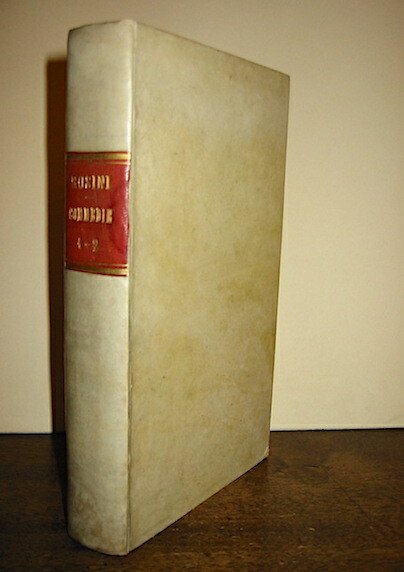 8vo (cm. 24), 2 Tomi legati in un volume, VII(1)-VIII pp., 2 cc.nn., XIII(1) pp., 1 c.nn., 259(1) pp.; 2 cc.nn., III(1) pp., 267 pp. Legatura coeva in pergamena rigida con titolo oro su tassello in pelle al dorso. Lievi sporadiche fioriture, ma ottimo stato di conservazione. E’ questa la parte delle Opere del Rosini relativa al teatro.