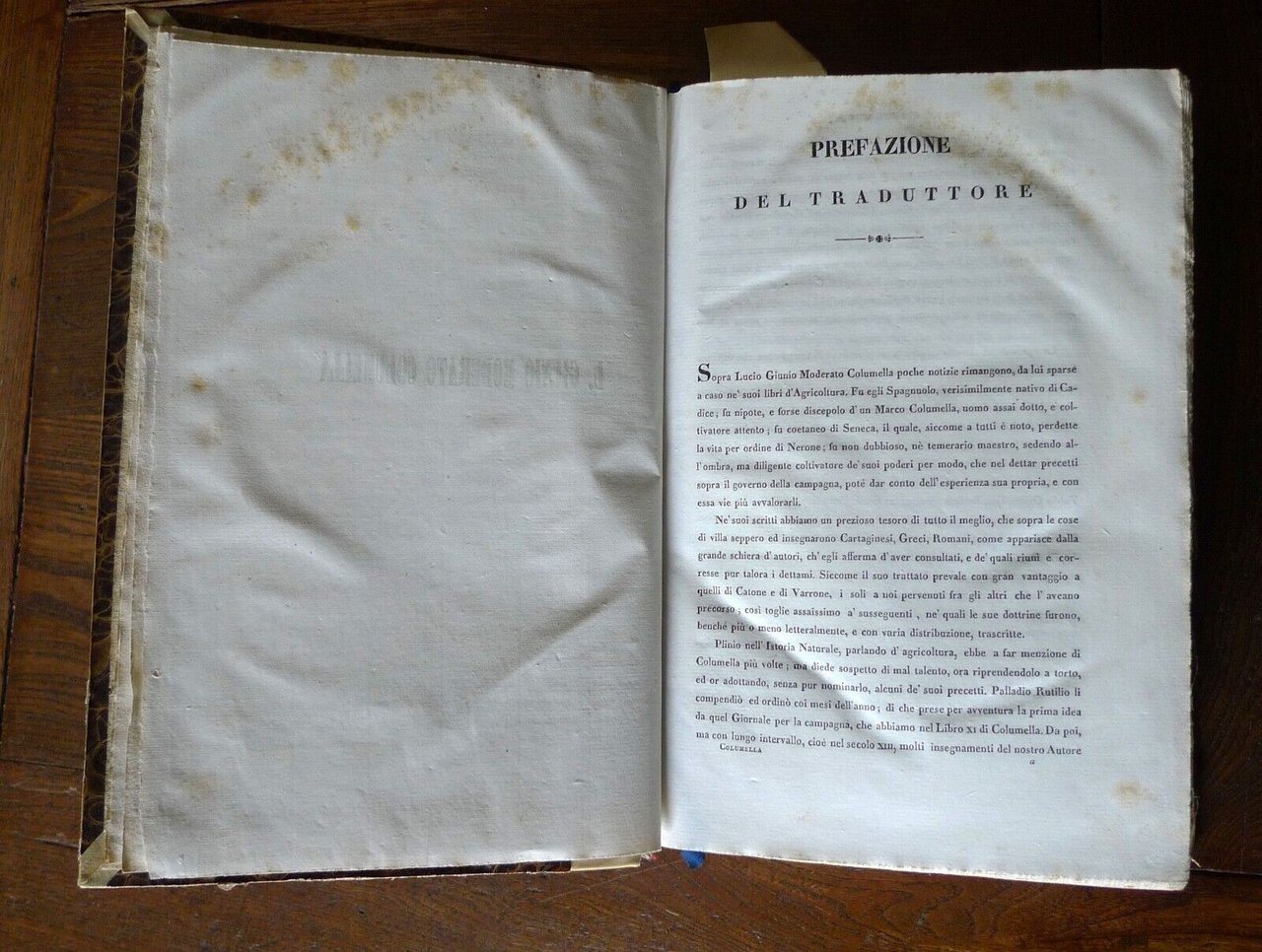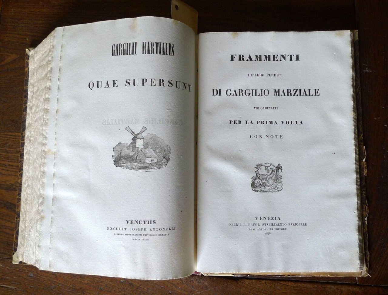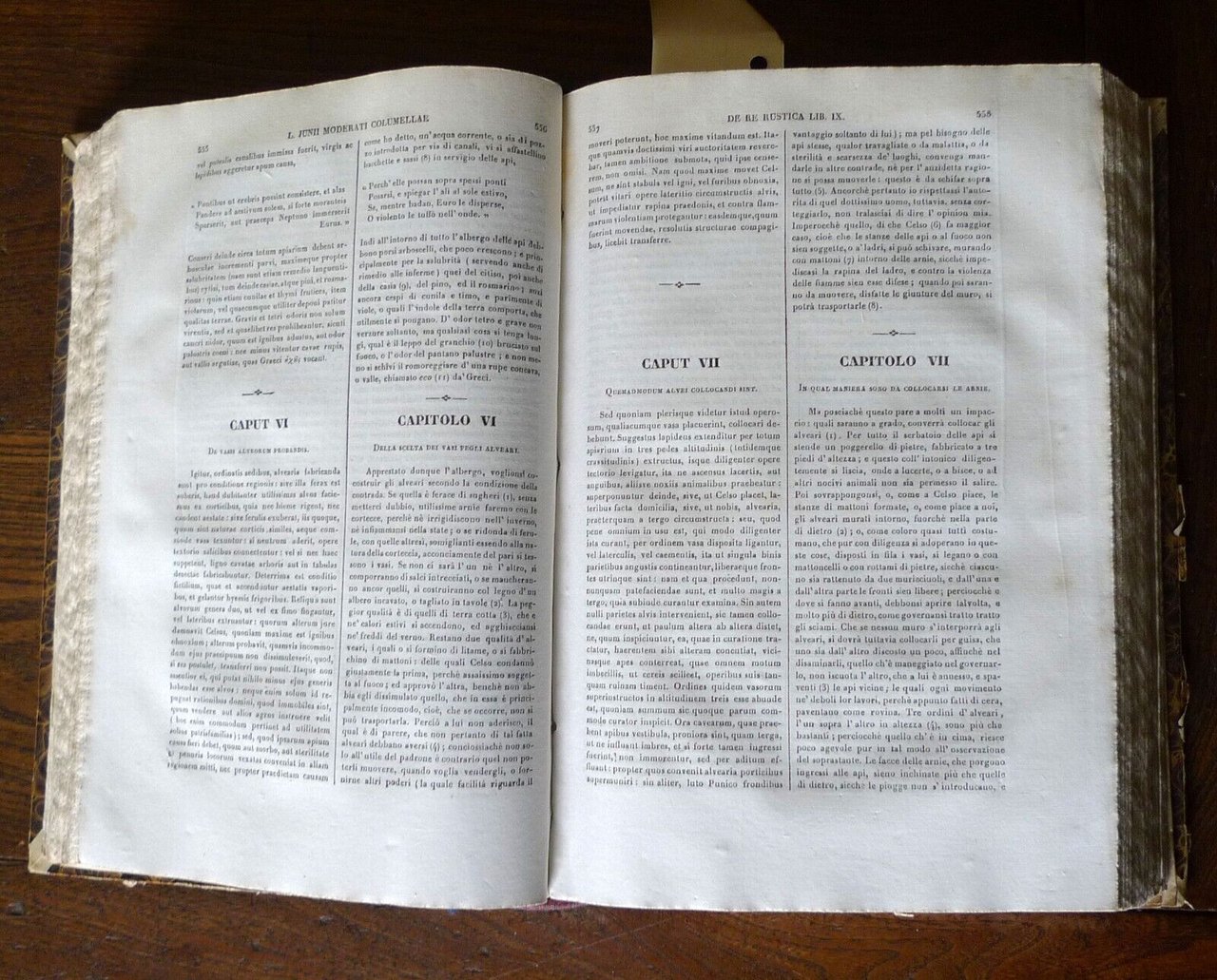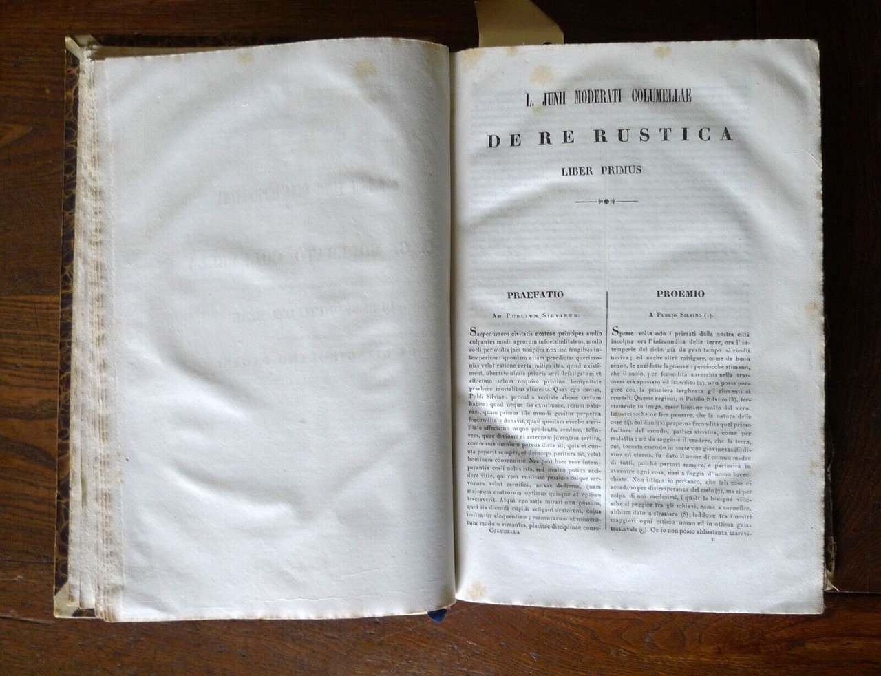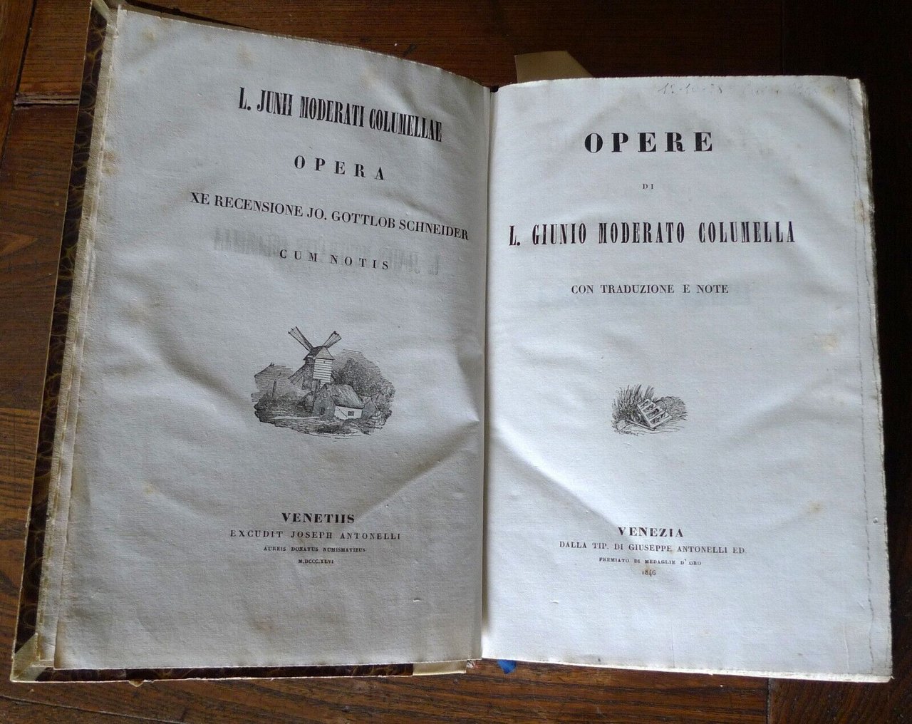 - L. JUNII MODERATI COLUMELLAE OPERAXE RECENSIONE JO. GOTTLOB SCHNEIDERCUM NOTIS OPERE DI L. GIUNIO MODERATO COLUMELLACON TRADUZIONE E NOTEVENETIIS, EXCUDIT JOSEPH ANTONELLI,VENEZIA, DALLA TIP. DI GIUSEPPE ANTONELLI ED.,M.DCCC.XLVI (1846),- GARGILII MARTIALIS QUAE SUPERSUNT FRAMMENTI DEI LIBRI PERDUTI DI GARGILIO MARZIALE,VOLGARIZZATI PER LA PRIMA VOLTA, CON NOTE.VENETIIS, EXCUDIT JOSEPH ANTONELLI,VENEZIA, NELL'I.R.PRIVIL.STABILIMENTO NAZIONALEDI G. ANTONELLI EDITORE, M.DCCC.XLVIII (1848)[2 LIBRI RILEGATI IN UN UNICO VOLUME, 2 OPERE COMPLETE]copertina rigida, rilegatura in mezza pelle,26,5x18 cm., pp.(numerazione per colonne, continua) LII-1748; testo su 2 colonne,testo in latino con traduzione italiana a fronte,BIBLIOTECA DEGLI SCRITTORI LATINICON TRADUZIONE E NOTE,è stato rilegato, alla fine del volume, un indice manoscritto (coevo) del contenuto delle opere,peso: kg.1,8