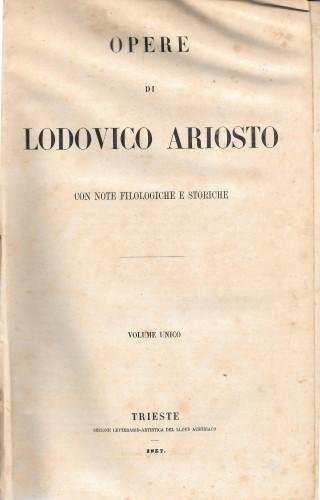 in 8° pp. XX, 175, 133, 462, 2 nn.; m/tela coeva con angoli, tit. in oro su tass. al ds., piatti marmor, ritratto dell'A. all'antip., testo su due colonne; prefaz. sulla vita e le opere dell'A. del dott. A. Racheli. "Della Vita e degli Scritti di L. A. - Commedie in versi e in prosa - Satire e Rime - Erbolato - Lettere - I Cinque Canti del Rinaldo ardito - Elegie - Poesie latine - Appendice - Orlando Furioso - I cinque canti - Frammenti". Ds. restaurato e lievi fior. 303/28