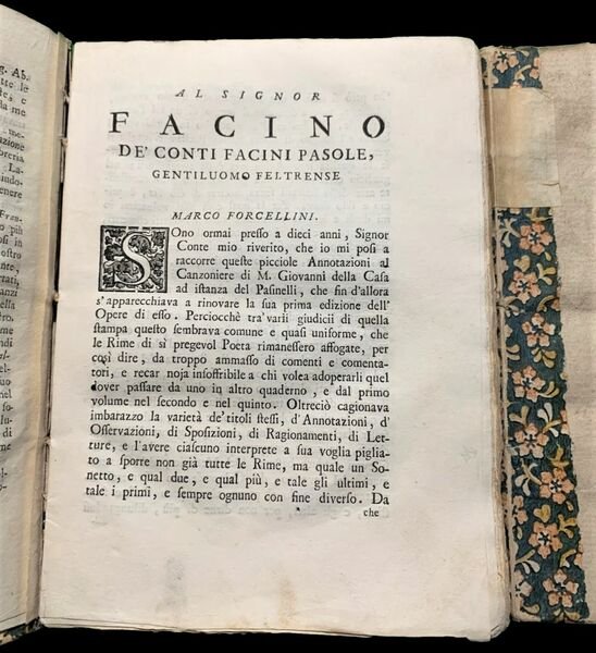 In 4° (24×18 cm); tre tomi: XVIII, (8), IX LXXX, 314, (2 b. ) pp., XXXI, (1), 268, (2 b.) pp., 156, 44, (2 b. ) pp. Questo dovrebbe essere uno dei primi ed essere uscito, essendo questo esemplare privo del ritratto di Giovanni della Casa che in questo esemplare, chiaramente, non è mai stato aggiunto. Con frontespizio proprio alla fine del terzo volume Due orazioni di Monsignor Gio. della Casa per muovere i veneziani a collegarsi col Papa, col Re di Francia e con gli Svizzeri, contro lImperador Carlo Quinto. In Lione, Appresso Bartolommeo Martin. Legature coeve in cartoncino molle dattesa con dorsi foderati con bella carta floreale. Fascetta con titolo, autore e numero del volume manoscritta da mano ottocentesca al dorso. Bellissime incisioni con scene animate ai frontespizi e alle testatine stampate con lastra a parte rispetto al testo. Alcune testatine ed iniziali xilografiche. Ex-libris privato applicato allinterno del piatto anteriore di ogni volume che identifica lesemplare come appartenuto a B. Guastalla. Seconda edizione veneta riveduta ed accresciuta dellopera del grande letterato, scrittore ed arcivescovo cattolico, Giovanni Della Casa, più conosciuto come monsignor Della Casa o monsignor Dellacasa (Borgo San Lorenzo, 28 giugno 1503 Montepulciano, 14 novembre 1556), celebre per il suo Galateo overo de costumi composto, probabilmente, dopo il 1551 a Calvisano, ma pubblicato solo postumo nel 1558. Scrive il Gamba al numero 290 della sua nota bibliografia Di questa nuova edizione si prese cura Marco Forcellini, riordinando le Opere, togliendo via molti Commenti, e ponendo in luogo loro brevi Annotazioni, ed una Tavola di tutte le voci usate dal Casa. Il Forcellini potè arricchire questa stampa di 43 Lettere non più stampate e di un Discorso in materia politica, indirizzato al Card. Caraffa ed al Casa attribuito. Nato a Borgo San Lorenzo del Mugello, Giovanni della Casa trovò il luogo ideale di crescita letteraria e di lavoro a Venezia dove nel suo palazzetto sul Canal Grande riuscì a riunire un importante cenacolo letterario. Nunzio Apostolico a Venezia, Della Casa introdusse il Tribunale dellInquisizione in Veneto seguendo direttamente diversi processi. Nel 1548 si deve a lui la redazione dellIndice dei Libri Proibiti. Con la morte del suo protettore Alessandro Farnese e lelezione di papa Giulio III cadde in disgrazia e dopo aver lasciato Roma, dove era ritornato per cercare di perorare la sua causa, si trasferì a Nervesa in provincia di Treviso ed è proprio qui che si suppone, finì la sua opera più celebre (probabilmente già iniziata a Venezia) Il Galateo che gli diede enorme fama dopo la sua pubblicazione postuma. Seconda edizione veneta, preferita alla prima per le numerose aggiunte e correzioni. Rif. Bib.: Gamba, 290; Razzolini, p. 96.