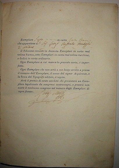 4to (cm. 29), 11 Voll., XLIX(I)-344(2) pp. con una tav. f.t.; 391(3) pp.; 377(1) pp.; 364 pp.; 446 pp.; 407(1) pp.; 405(3) pp.; 433(3) pp.; 434(2) pp.; 445(3) pp.; 261(1) pp. Assente il ritratto. Legature coeve in mz. pelle con angoli. Fili, fregi e titoli in oro su tre tasselli in pelle al ds. Alcuni volumi con il ds. sapientemente restaurato, altri con piccole fenditure alle cerniere, ma nel complesso esemplare in buono stato di conservazione. Sulla carta che precede il frontis. del primo volume l’Editore e il Tipografo attestano con propria firma autografa che l’edizione è formata da 200 esemplari in carta real velina bianca, 8 esemplari in carta real velina turchina e 12 in carta ordinaria (spera). Il ns. esemplare è il n. 6 dei 12 in carta spera, appartenuto al Sig. Raffaello Luigi Formiggini di Milano.