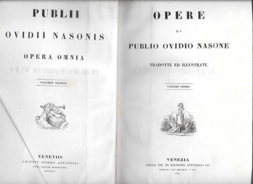 in 8°, CXXXVI colonne, 446 col., 1 p. nn., 2 p. bianche.; 6 pp. nn., 624 col.; 8 pp. nn., 26 col., 1 p. b., 2 p. nn., 374 col., 1 p. b., 272 col. Legatura coeva con tit. e fregi in oro al ds., piatti marmor., numerose vignette ai doppi front. delle varie opere. Biblioteca degli scrittori latini con traduzioni e note, testo su 2 colonne latino italiano a fronte. Esemplare fresco con bella carta bianca; solo piccole sbucc. alla leg. 319/34