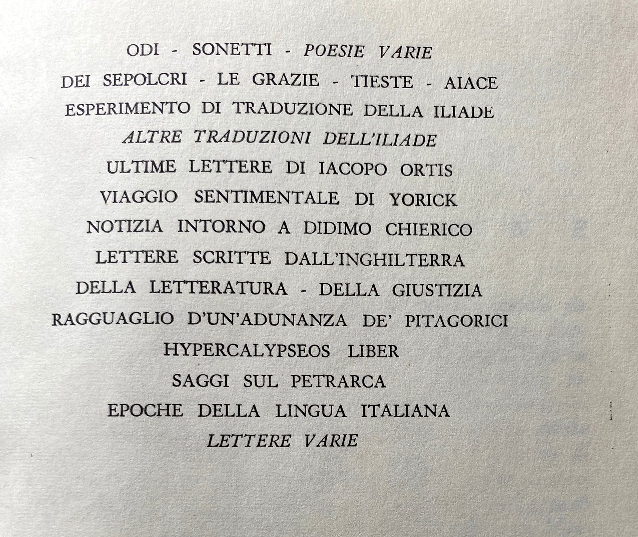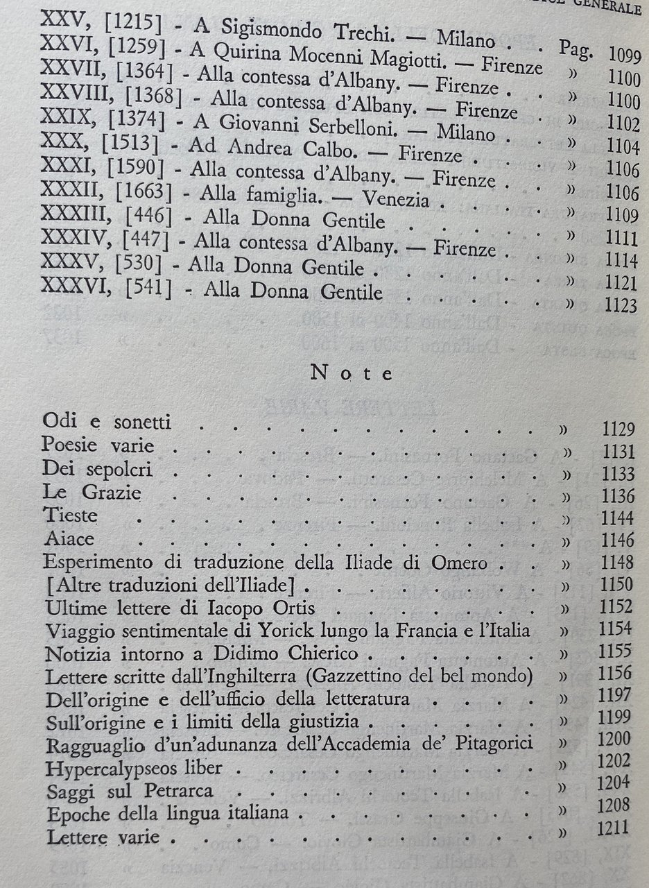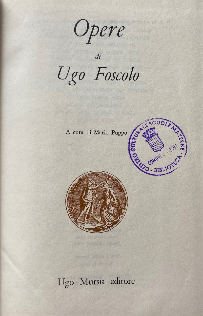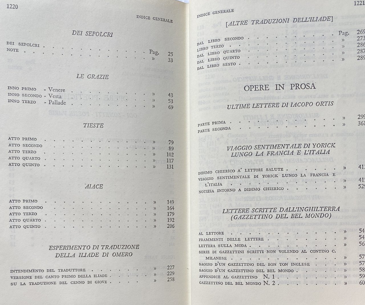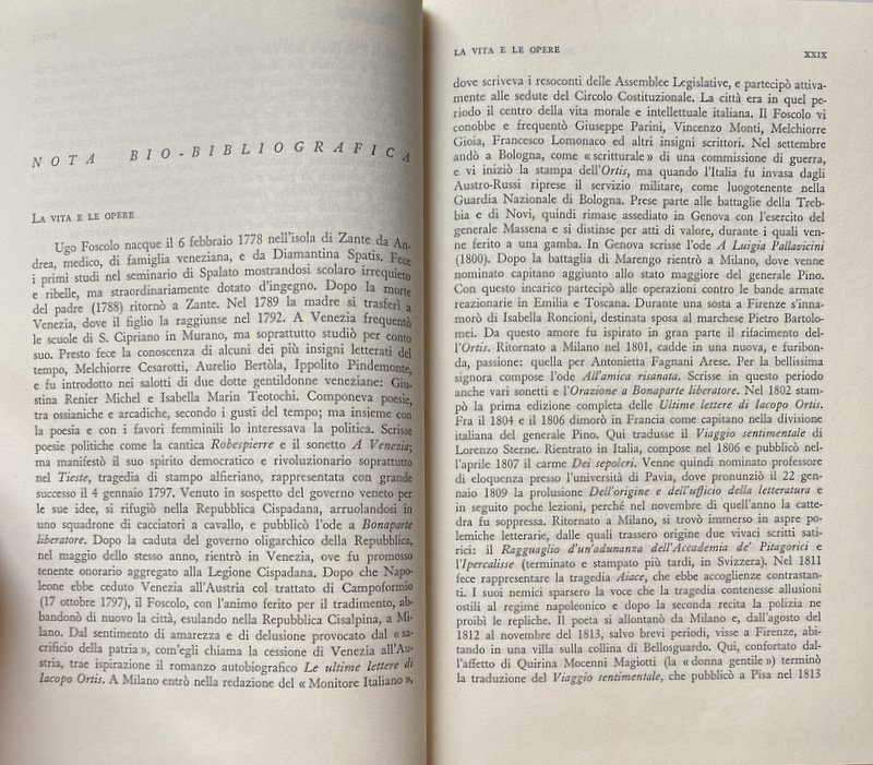 Titolo: Le opere: Contiene: Versi dell'adolescenza, versi giovanili, Odi, Sonetti, Poesie varie, epigrammi, Dei sepolcri, Le grazie, Tieste, Aiace, Ricciarda, Esperimento di traduzione dell'Iliade, versioni e imitazioni, Ultime lettere di Iacopo Ortis, Viaggio sentimentale di Yorick, Notizia intorno a Didimo Chierico, Lettere scritte dall'Inghilterra, Della letteratura, Della Giustizia, Ragguaglio d'un'adunanza de' pitagorici, Hypercalypseos liber, Saggi sul Petrarca, Epoche della lingua italiana, Lettere varie