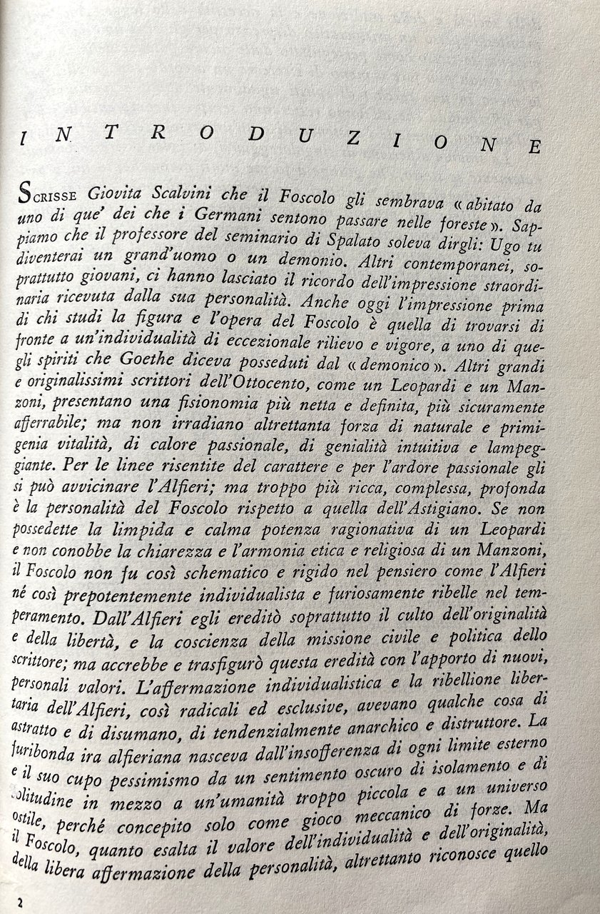 INTRODUZIONE. Scrisse Giovita Scalvini che il Foscolo gli sembrava «abitato da Sc uno di que' dei che i Germani sentono passare nelle foreste». Sappiamo che il professore del seminario di Spalato soleva dirgli: Ugo tu diventerai un grand'uomo o un demonio. Altri contemporanei, soprattutto giovani, ci hanno lasciato il ricordo dell'impressione straordinaria ricevuta dalla sua personalità. Anche oggi l'impressione prima di chi studi la figura e l'opera del Foscolo è quella di trovarsi di fronte a un'individualità di eccezionale rilievo e vigore, a uno di quegli spiriti che Goethe diceva posseduti dal «demonico». Altri grandi e originalissimi scrittori dell'Ottocento, come un Leopardi e un Manzoni, presentano una fisionomia più netta e definita, più sicuramente afferrabile; ma non irradiano altrettanta forza di naturale e primigenia vitalità, di calore passionale, di genialità intuitiva e lampeggiante. Per le linee risentite del carattere e per l'ardore passionale gli si può avvicinare l'Alfieri; ma troppo più ricca, complessa, profonda è la personalità del Foscolo rispetto a quella dell'Astigiano. Se non possedette la limpida e calma potenza ragionativa di un Leopardi e non conobbe la chiarezza e l'armonia etica e religiosa di un Manzoni, il Foscolo non fu così schematico e rigido nel pensiero come l'Alfieri né così prepotentemente individualista e furiosamente ribelle nel temperamento. Dall'Alfieri egli ereditò soprattutto il culto dell'originalità e della libertà, e la coscienza della missione civile e politica dello scrittore; ma accrebbe e trasfigurò questa eredità con l'apporto di nuovi, personali valori. L'affermazione individualistica e la ribellione libertaria dell'Alfieri, così radicali ed esclusive, avevano qualche cosa di astratto e di disumano, di tendenzialmente anarchico e distruttore. La e il suo cupo pessimismo da un sentimento oscuro di isolamento e di furibonda ira alfieriana nasceva dall'insofferenza di ogni limite esterno e di solitudine in mezzo a un'umanità troppo piccola e a un universo il Foscolo, quanto esalta il valore dell'individualità e dell'originalità, stile, perché concepito solo come gioco meccanico di forze. Ma della libera affermazione della personalità, altrettanto riconosce quello della società e della tradizione e la necessità della legge.