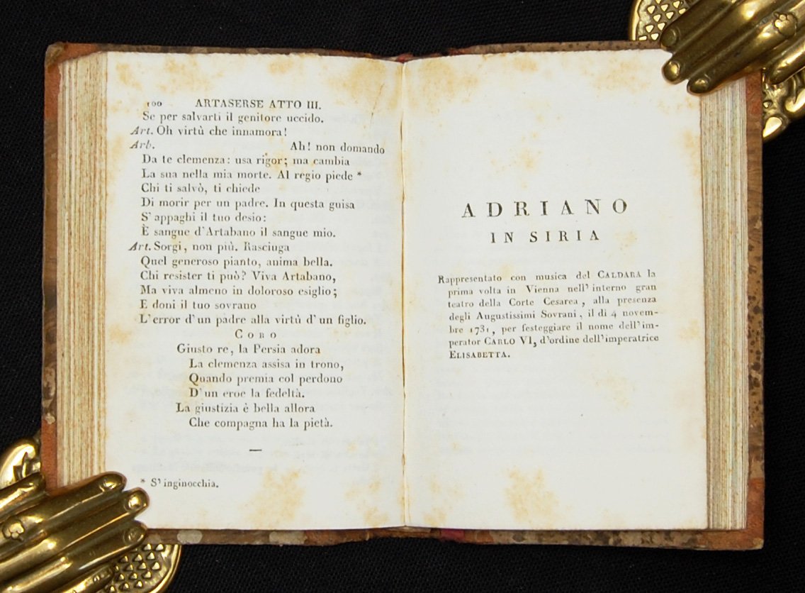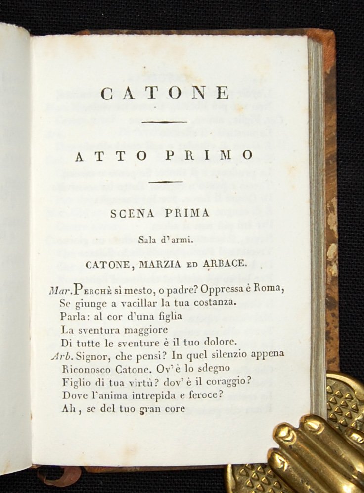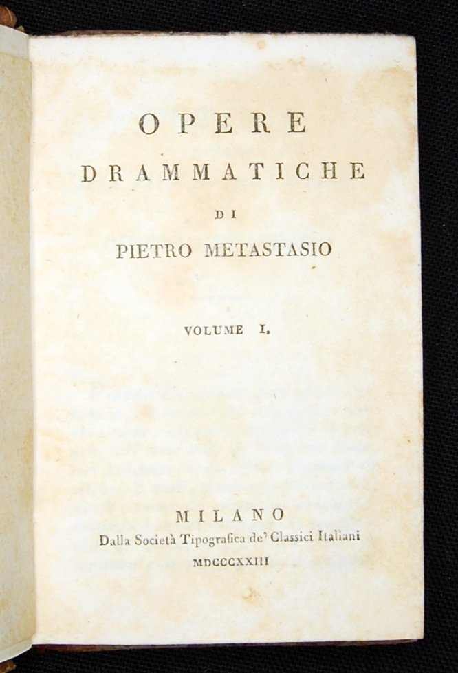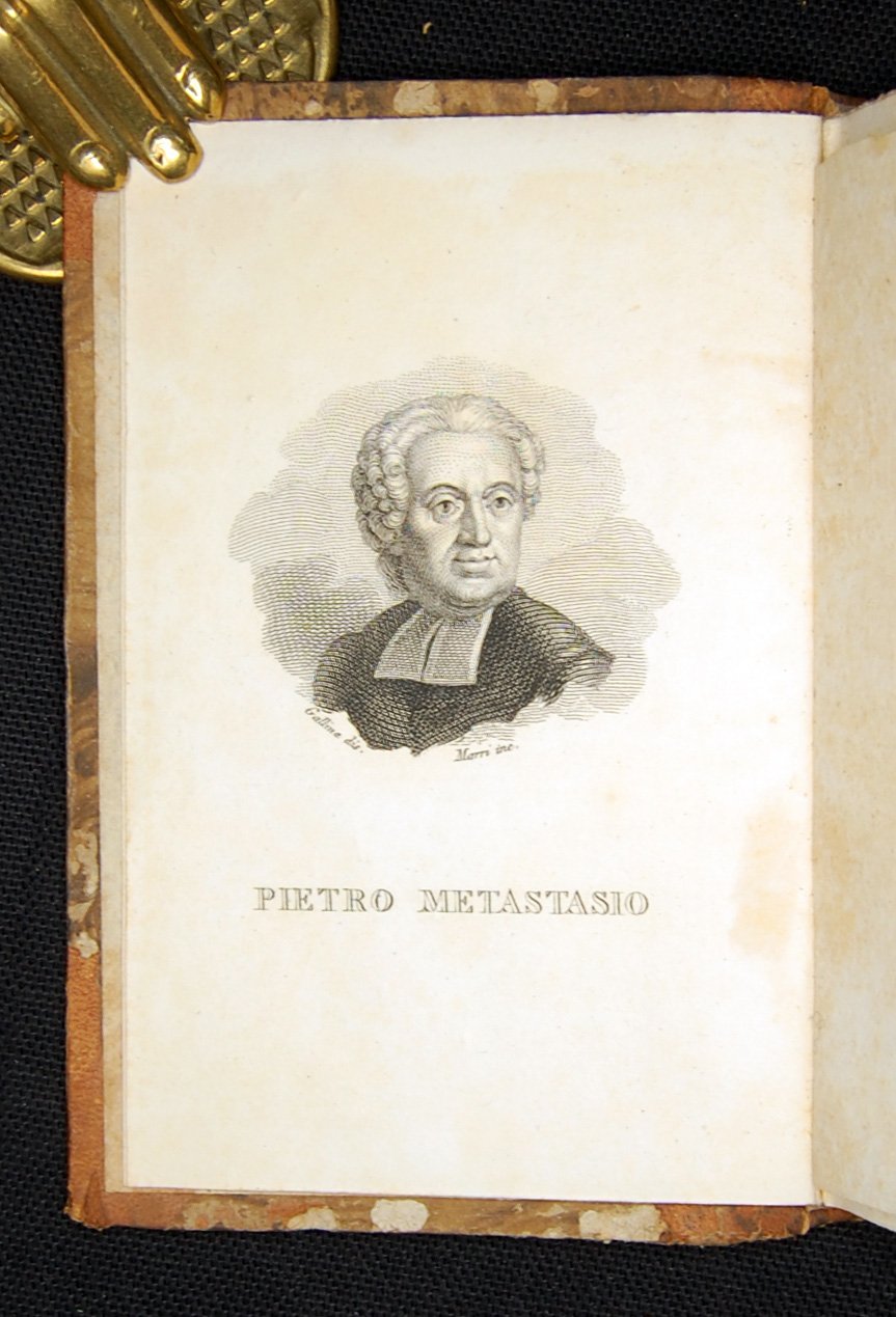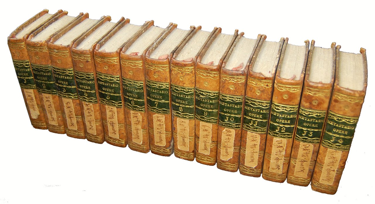 12mo (108x72 mm), leg. coeva in mezza pelle con carta marmorizzata ai piatti, titolo dorato su tassello in pelle verde al dorso, nastrini segnapagine; 14 volumi; pp. XVI, 194, [2], [1] c. di tav.; 271, [1]; 260, [4]; 244, [4]; 275, [5]; 249, [3]; 270, [2]; 237, [3]; 242, [2]; 242, [2]; 244, [4]; 236, [4]; 346, [i.e. 246], [2]; 264. Ritratto del Metastasio inciso all'antiporta del primo volume. Ref.: IT\ICCU\VEAE\001681. Cond.: Lievi segni d'uso alle legature (abrasioni alle carte dei piatti). Occasionali fioriture e bruniture alle carte. Set molto buono. -- Very good set of this collection of dramas by Metastasio in 14 volumes, bound in half leather with marbled paper at boards and gilt title on label at spine.