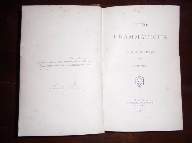 MILANO, LIBRERIA EDITRICE, 1877. In 16∞: pp. 352 + pp. 295.; pp. 225 + 279.; pp. 281 + pp. 228.; pp. 274 + pp. 296.; pp. 303 +pp. 242.; pp. 301 +pp. 333. Leg.coeva non edit. stanca in mz. pelle rossa, piatti cart., dorsi spellati. Ex libris, qualche fioritura. Citiamo le opere comprese nei 6 voll. Tomo 1-2. Goldoni e le sue sedici commedie nuove - Commedia storica in quattro atti. La scuola degli innamorati - Commedia in quattro atti. La satira e Parini - Commedia storica in quattro atti. Una poltrona storica ossia la coda di un gran poeta in erba - Commedia in un atto diviso in due parti. Tomo 3-4. Cause ed effetti - Commedia in cinque atti. Dolcezza e rigore - Commedia in un atto - in versi per giovinette. Prosa - Commedia in cinque atti. L`Attrice cameriera - Commedia in tre atti - in versi martelliani. Tomo 5-6. Gli uomini serj - Commedia in cinque atti in prosa. Il codicillo dello Zio Venanzio - Commedia in tre atti. Dante a Verona - Commedia in cinque atti. Nessuno va al campo - Commedia in due atti. Tomo 7-8. La donna e lo scettico - Commedia in tre atti in versi martelliani. Vecchie storie ovvero carbonari e sanfedisti - Dramma in un prologo e cinque atti. Roberto Vighlius - Dramma in cinque atti. Il duello - Commedia in cinque atti. Tomo 9-10. La bottega del Cappellajo - Scene popolari - Commedia in un atto. Il lion in ritiro - Commedia in cinque atti in versi. La medicina di una ragazza malata - Scene popolari in un atto. Amore senza stima (dalla Moglie saggia di Goldoni) - Commedia in cinque atti. Il cantoniere - Commedia in un atto in versi. Persuadere, convincere e commuovere - Scherzo comico in un atto. Tomo 11-12. Il ridicolo - Commedia in cinque atti. Marianna - Dramma in tre atti. Il poltrone - Commedia in un atto in versi martelliani. Il suicidio - Commedia in cinque atti. Amici e rivali - Commedia in cinque atti. (Tratta dal Vero Amico di Goldoni.)
