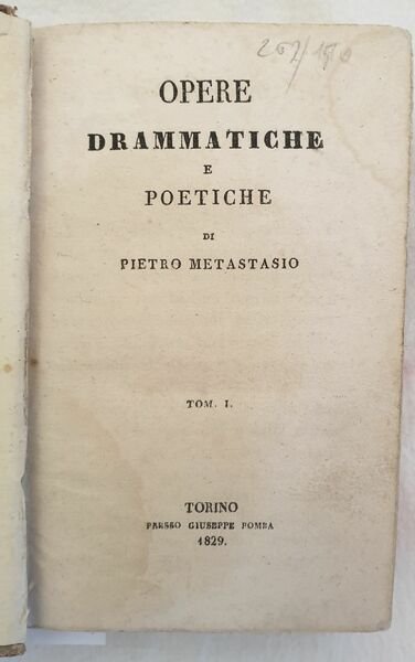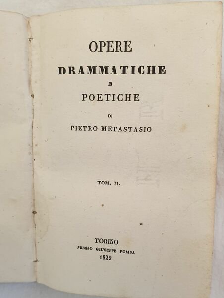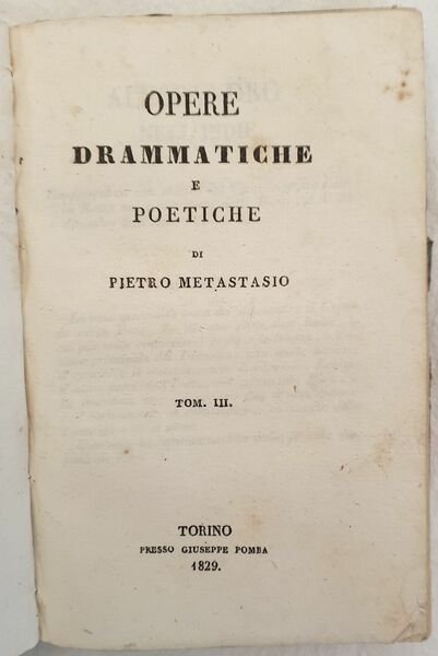 Edizione del 1829-30 di questa raccolta di opere drammatiche e poetiche di Pietro Metastasio (1698-1782). L'opera era composta da 15 volumi, siamo in possesso dei tomi I, II e III legati insieme in un unico volume. All'interno: vita di Metastasio, Didone abbandonata, Siroe, Siface, Catone in Utica, Ezio, Alessandro nell'Indie, Semiramide, Artaserse. In buone condizioni. Copertina cartonata in mediocri condizioni generali con usure ai margini e dorso mancante. Legatura in discrete condizioni con lievi rotture. Pagine in buone condizioni con fioriture. In 24. cm 13,5x9. Pp. 172+(6)+211+(1)+181+(1). Edition of 1829-30 of this collection of dramatical and poetical works by Pietro Metastasio (1698-1782). We only have the tomes I, II and III bound together in a unique volume. Inside: life of Metastasio, Didone abbandonata, Siroe, Siface, Catone in Utica, Ezio, Alessandro nell'Indie, Semiramide, Artaserse. In good conditions. Half carton cover in poor general conditions with wearings in the edges and spine lacking. Binding in fair conditions with light cracks. Pages in good conditions with foxings. In 24. cm 13,5x9. Pp. 172+(6)+211+(1)+181+(1).