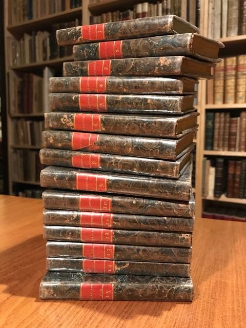 15 volumi in-24° (cm. 12,7), legature coeve in cartonato marmorizzato con titoli in oro su tasselli ai dorsi; tagli gialli; fioriture sparse. Cfr. Bottasso 159. Buon esemplare.